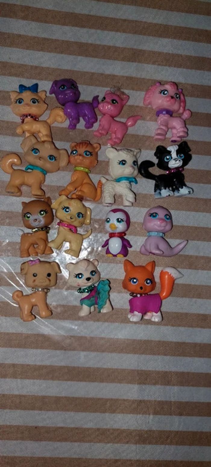 Lot de 15 figurines animaux vintage Polly pocket : Plusieurs chiens, chats, un phoque, un agneau, un tigre et un pingouin : Numéros : 26 / 28 / 45 / 48 / 52 / 53/ 54 / 113 / 118 / 119 / 120 / 93 / 1 Numéro effacé écrit N40 sur le ventre / 2 chiens pailletés rose et violet sans Numéro.