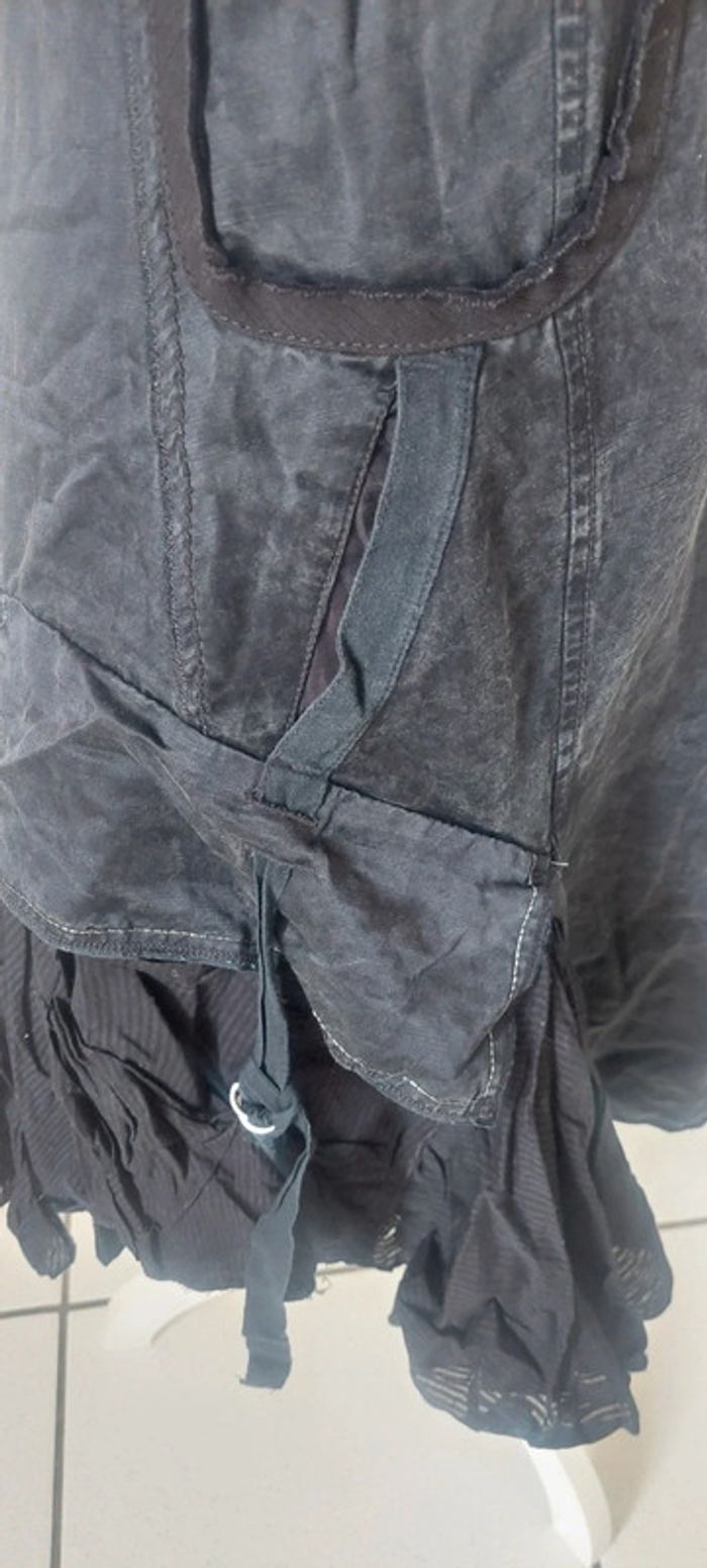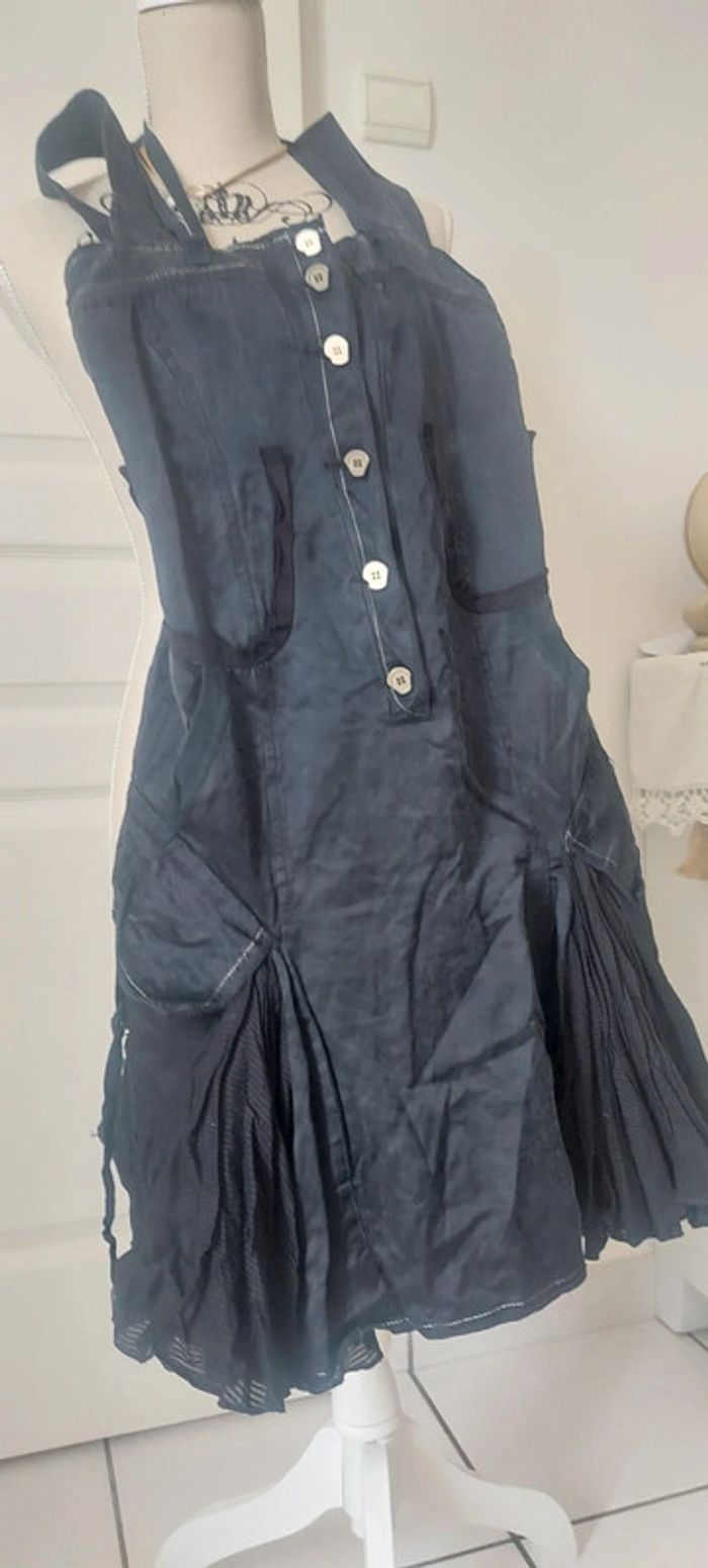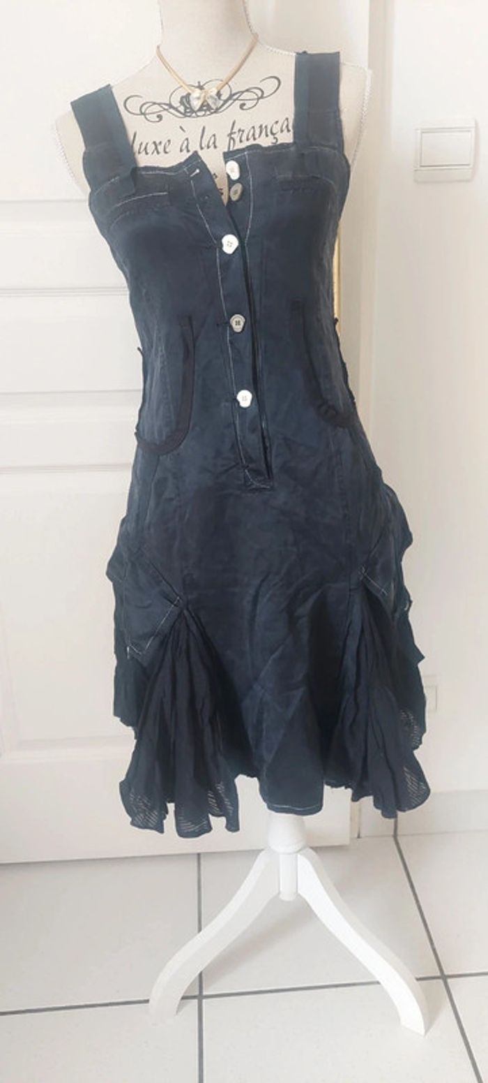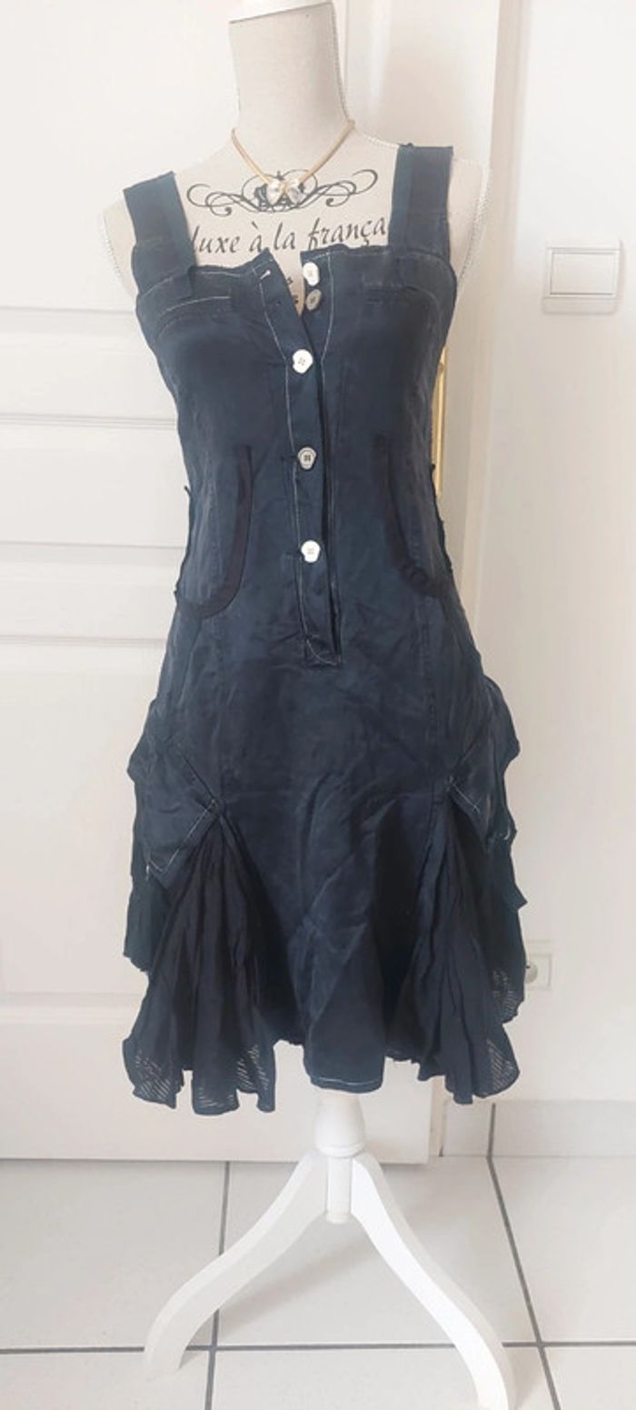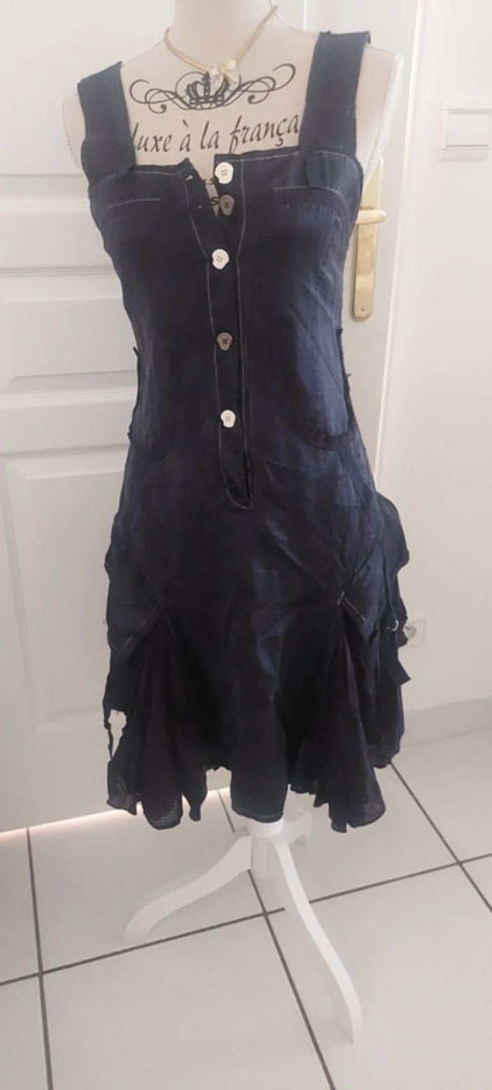 Robe vintage de marque Marithé François Girbaud noir délavé en très bon état. Sublime et originale robe à bretelles réalisée dans une coupe déstructurée, asymétrique Matières : soie, lin, coton surpiqures fil argenté qui font le pourtour de la robe. Fermeture par un alignement de boutons blanc cassé et kaki à effet cassés. Poche travers passepoilée de chaque côté. Large poche à fermeture rabat avec lien et boucle coulissante à modeler selon vos envies pour relever les côtés de la robe de chaque côté. La robe se termine sur deux niveaux avec l'empiècement d'un jupon sur les côtés d'un tissu à rayures donnant du volume à la robe. Martingale dans le haut du dos à ajuster par une boucle coulissante selon votre convenance. Sur la partie basse, pans flottants avec des surpiqures argentées Sublime robe avec ces jeux de pinces, de plis, de couture, de couleurs. Une véritable merveille Tout le raffinement des créateurs Girbaud