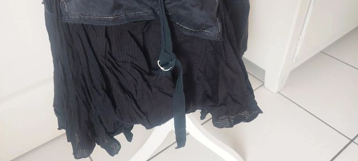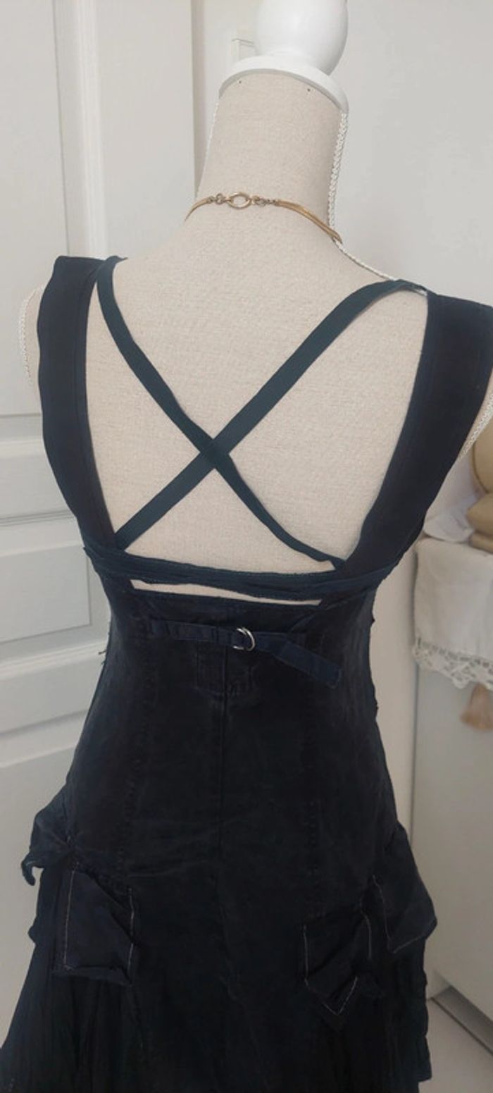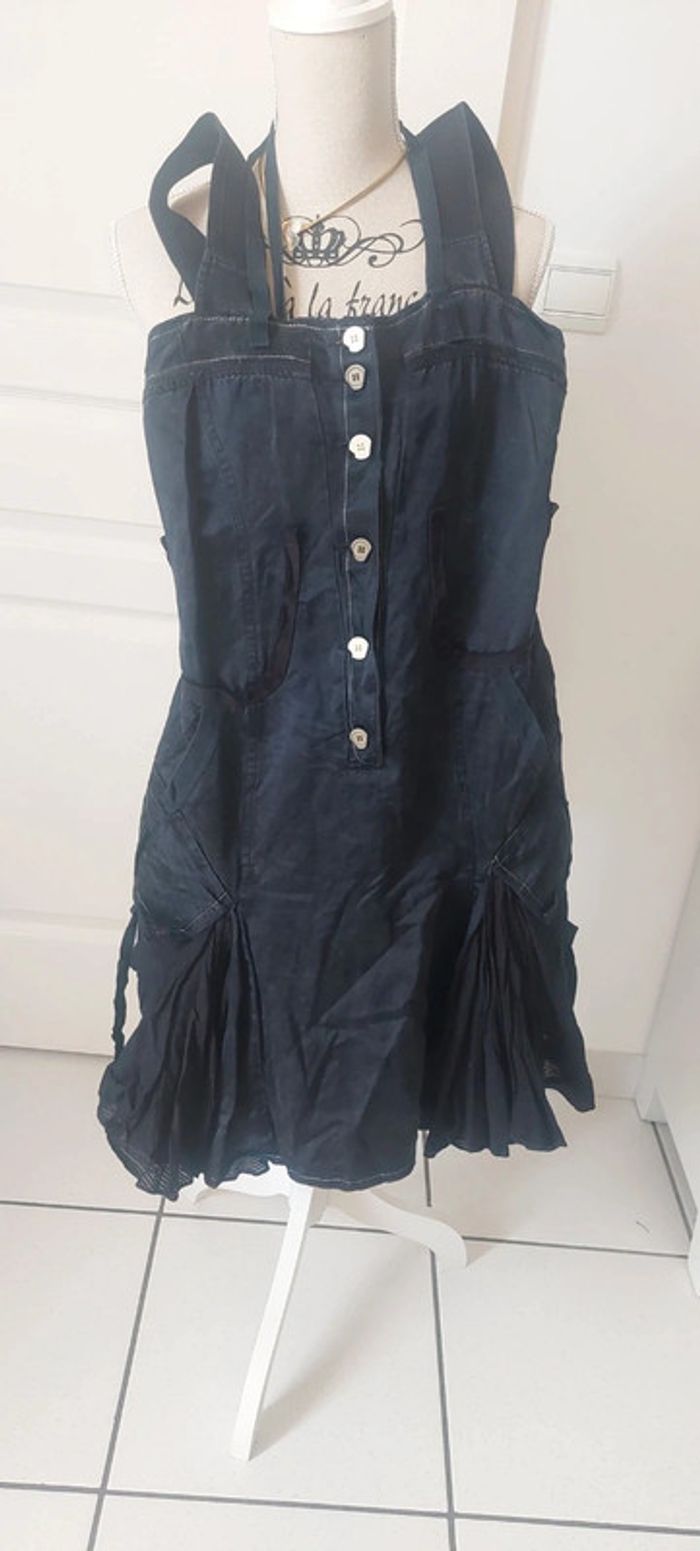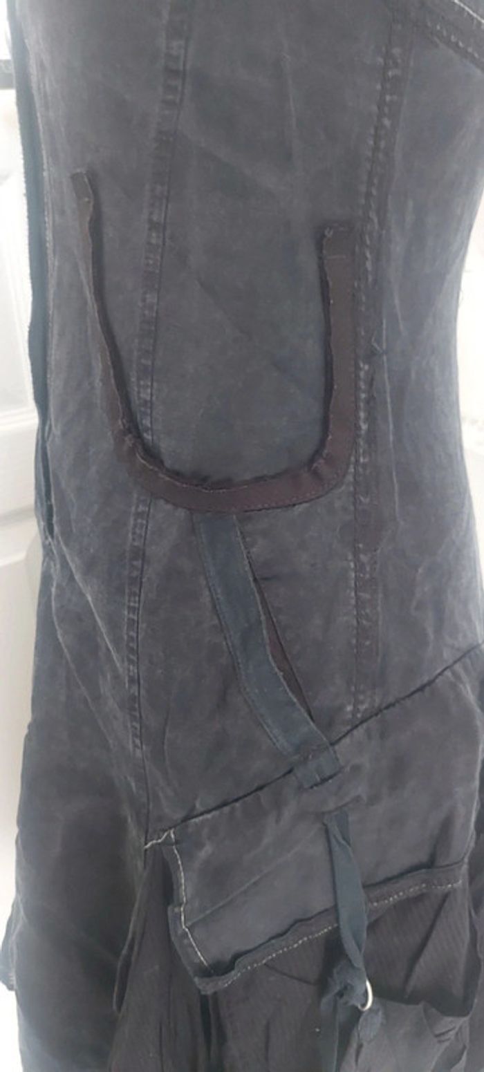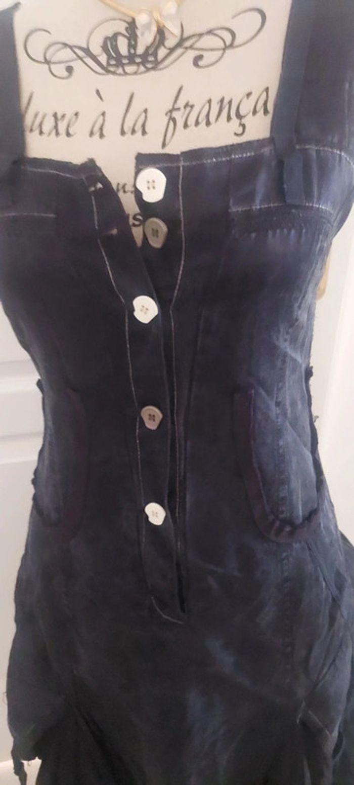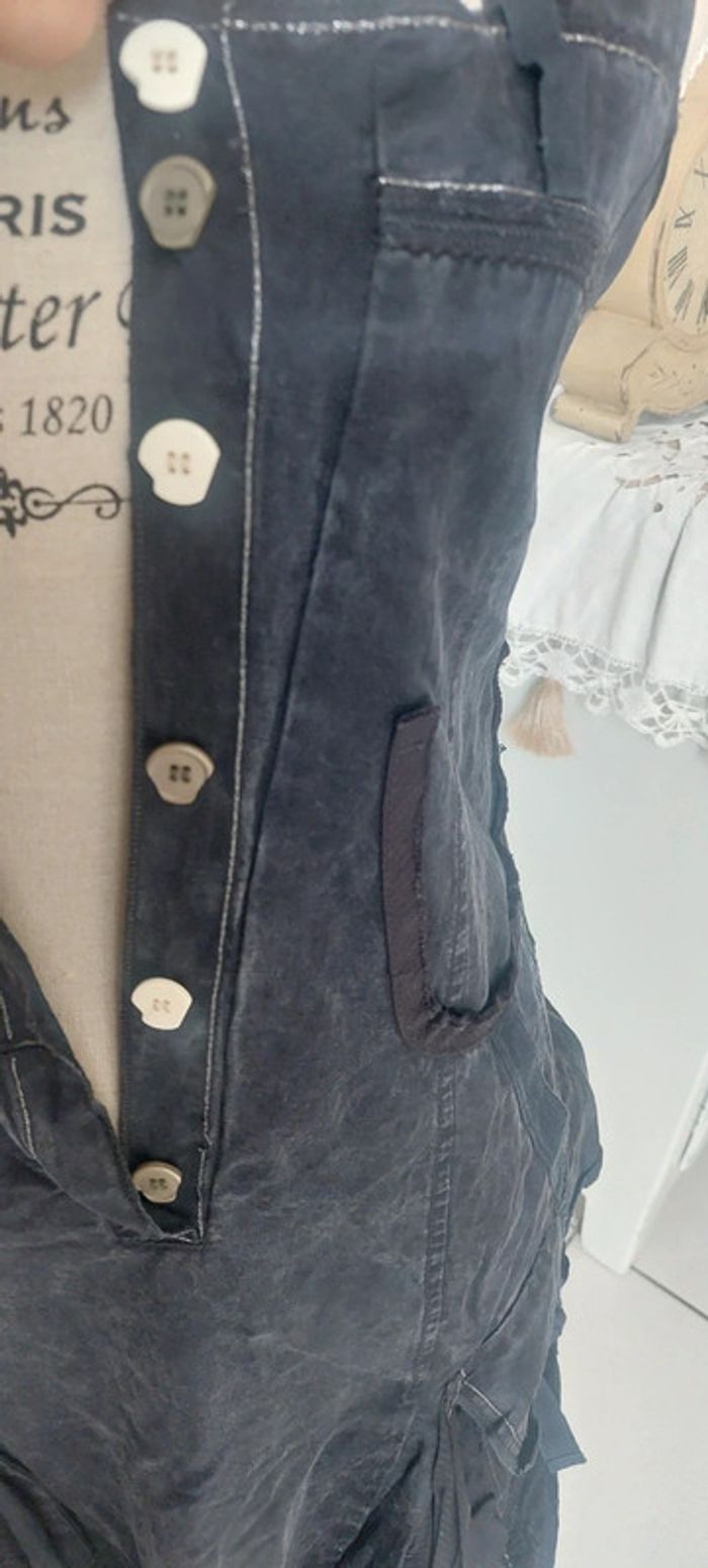 Robe vintage de marque Marithé François Girbaud noir délavé en très bon état. Sublime et originale robe à bretelles réalisée dans une coupe déstructurée, asymétrique Matières : soie, lin, coton surpiqures fil argenté qui font le pourtour de la robe. Fermeture par un alignement de boutons blanc cassé et kaki à effet cassés. Poche travers passepoilée de chaque côté. Large poche à fermeture rabat avec lien et boucle coulissante à modeler selon vos envies pour relever les côtés de la robe de chaque côté. La robe se termine sur deux niveaux avec l'empiècement d'un jupon sur les côtés d'un tissu à rayures donnant du volume à la robe. Martingale dans le haut du dos à ajuster par une boucle coulissante selon votre convenance. Sur la partie basse, pans flottants avec des surpiqures argentées Sublime robe avec ces jeux de pinces, de plis, de couture, de couleurs. Une véritable merveille Tout le raffinement des créateurs Girbaud