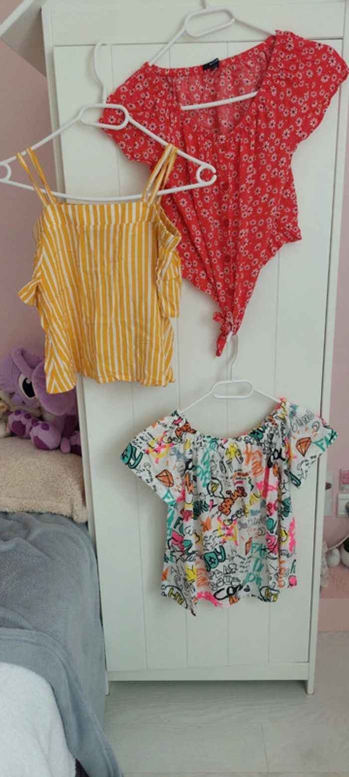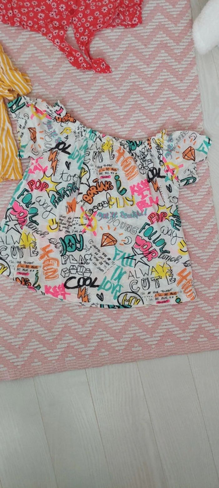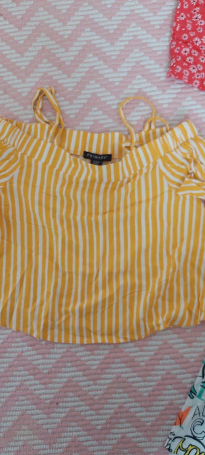 Lot de 3 hauts/top d'été pour fille comme neufs non portés 1 haut rayures jaune et blanc de marque Primark 8-9 ans (taille grand même 10 ans) 1 haut rouge à fleurs blanches de marque Kiabi taille XXS (12 ans) 1 haut blanc motifs multicolore marque Zara Girls 8 ans (taille grand même 10 ans 10 euros le lot