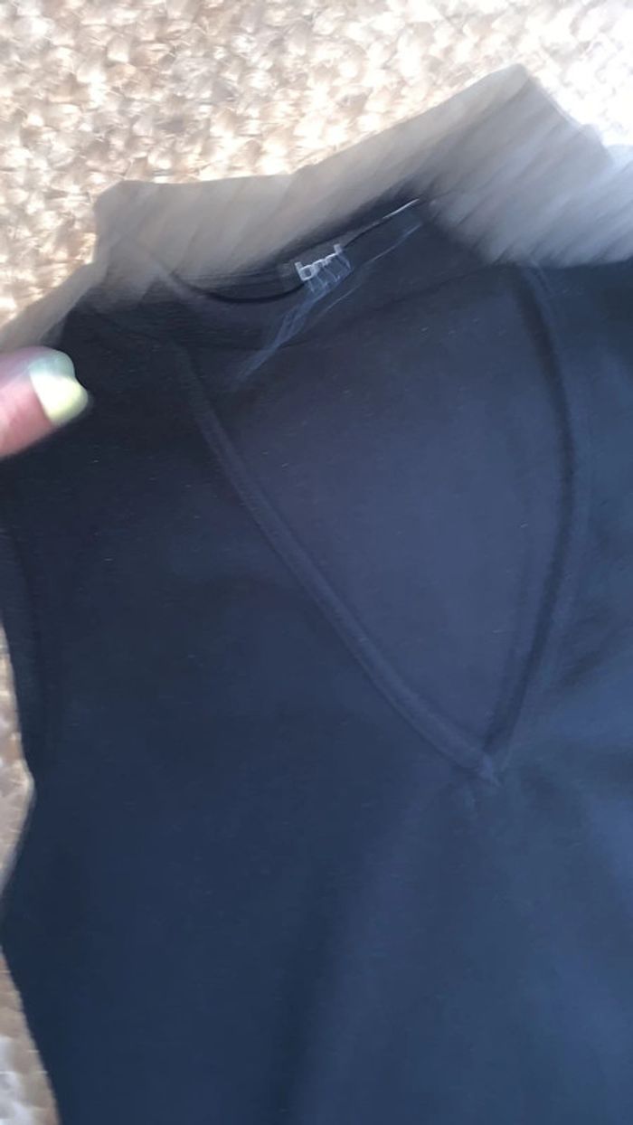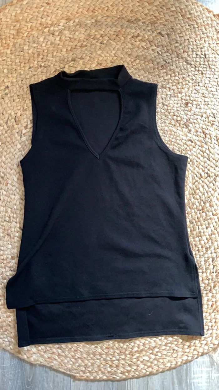 Débardeur noir à décolleté et detail collier près du coup Très agréable à porte élastique Taille 40 mais taille plus comme un 38