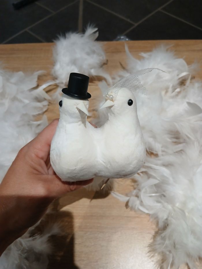 Lot de décoration de mariage. Donne avec boules plumes à accroché un peu défraîchie les 3 dernières photos.