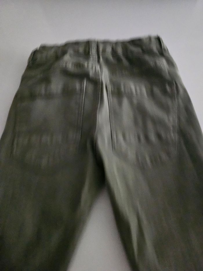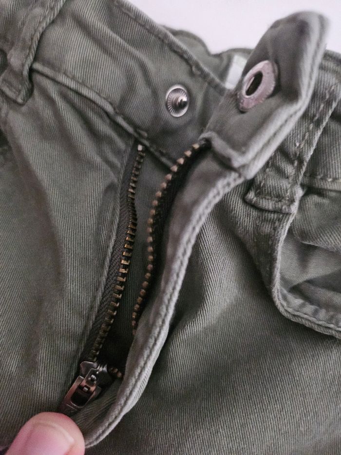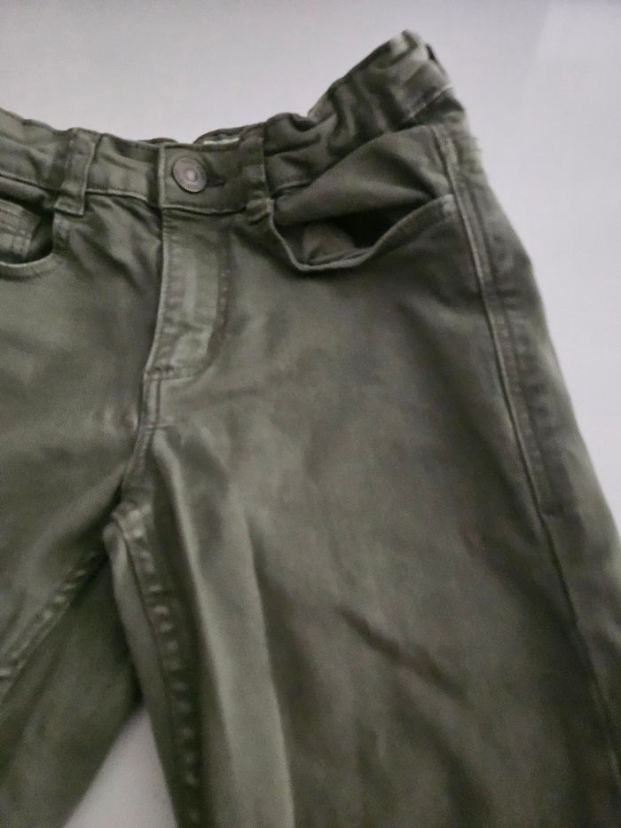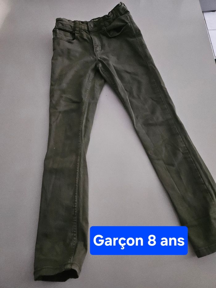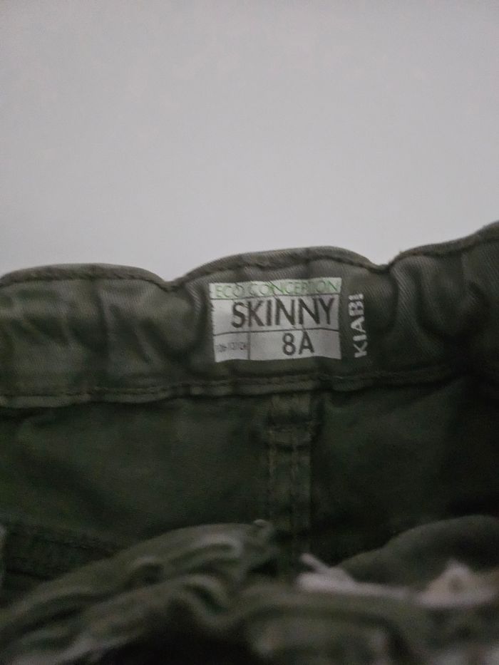 Jean skinny vert kaki. Se ferme par pression et fermeture. Taille réglable. Poches devant et derrière. Marque: Kiabi Taille : 8 ans