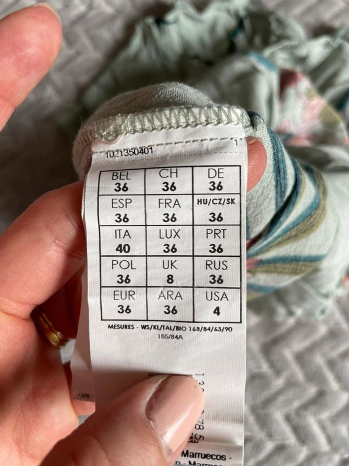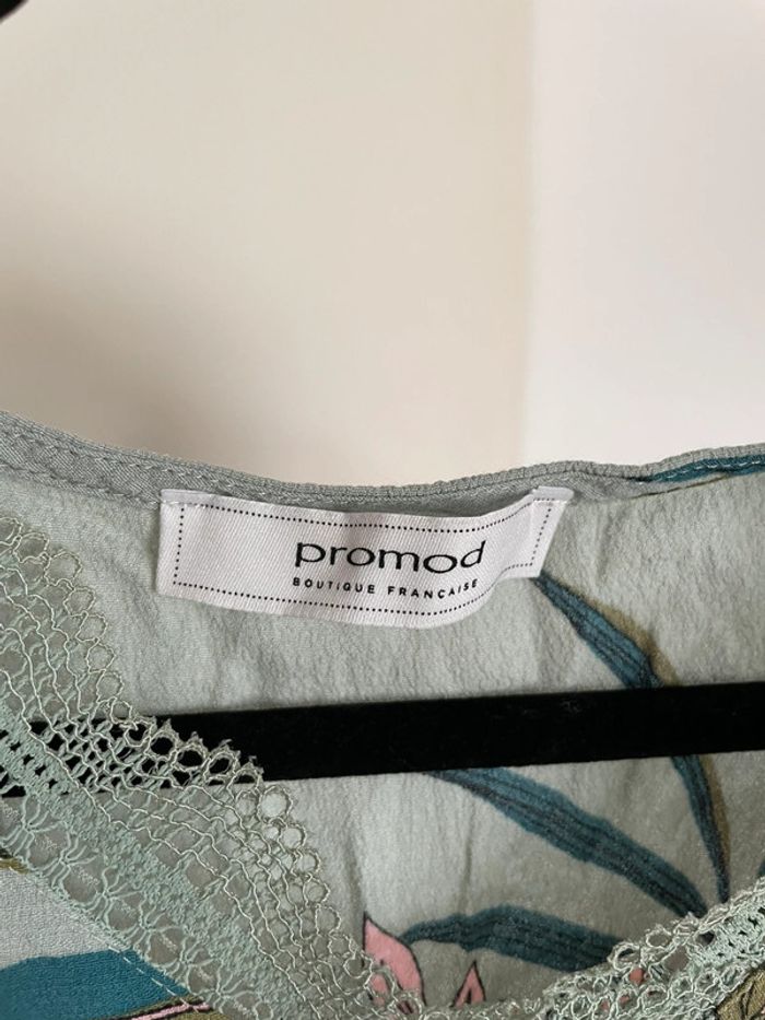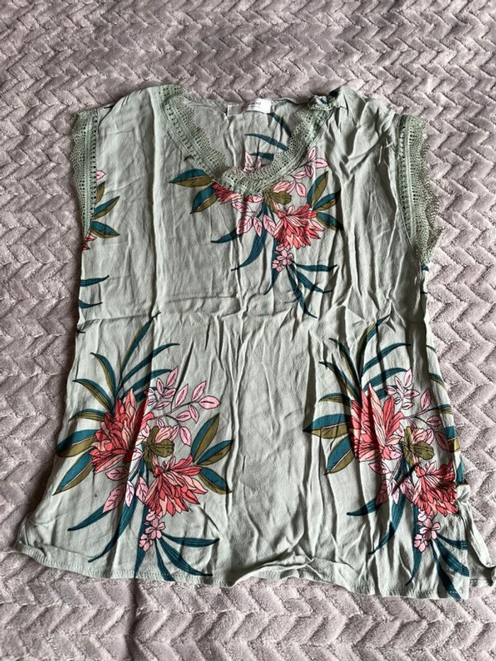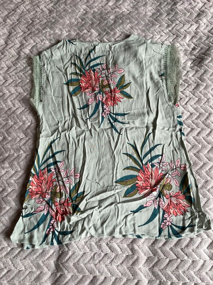 Blouse manches courtes, avec petite dentelle en collure et manches Taille 36 Motif fleuri sur fond vert d’eau Marque Camaïeu