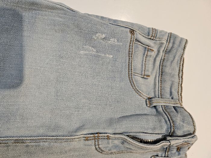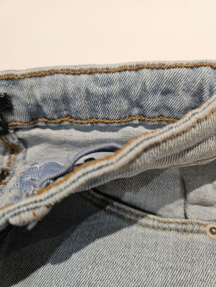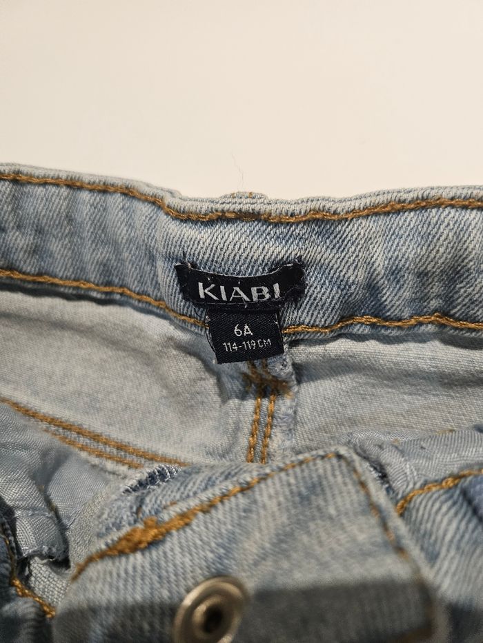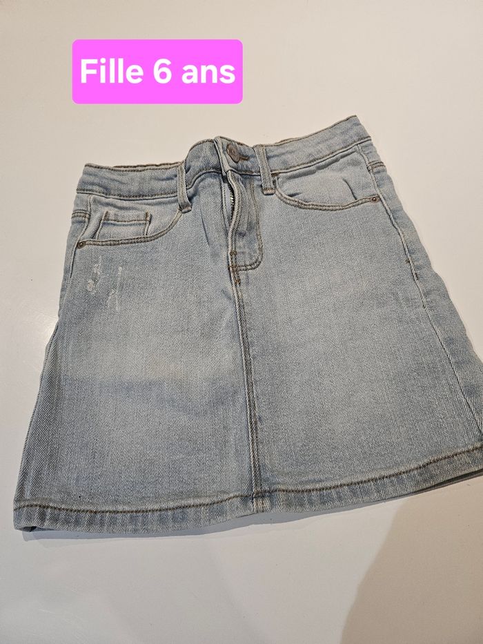 Jupe courte en jean bleu clair. Se ferme par pression et fermeture. Taille réglable. Poches devant et derrière. Marque : Kiabi Taille : 6 ans