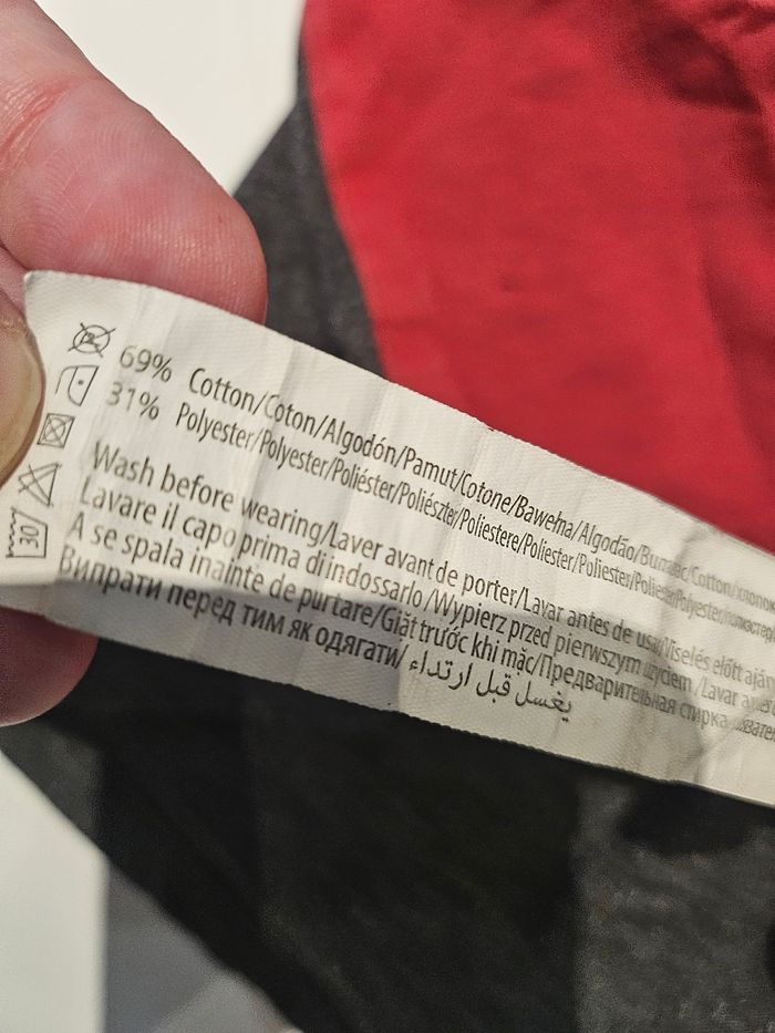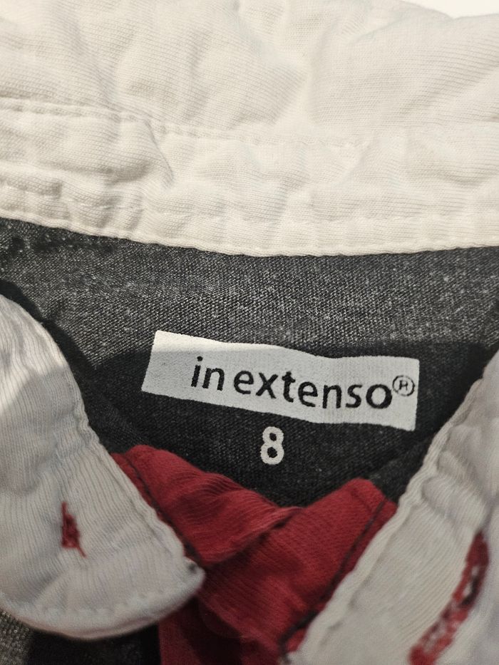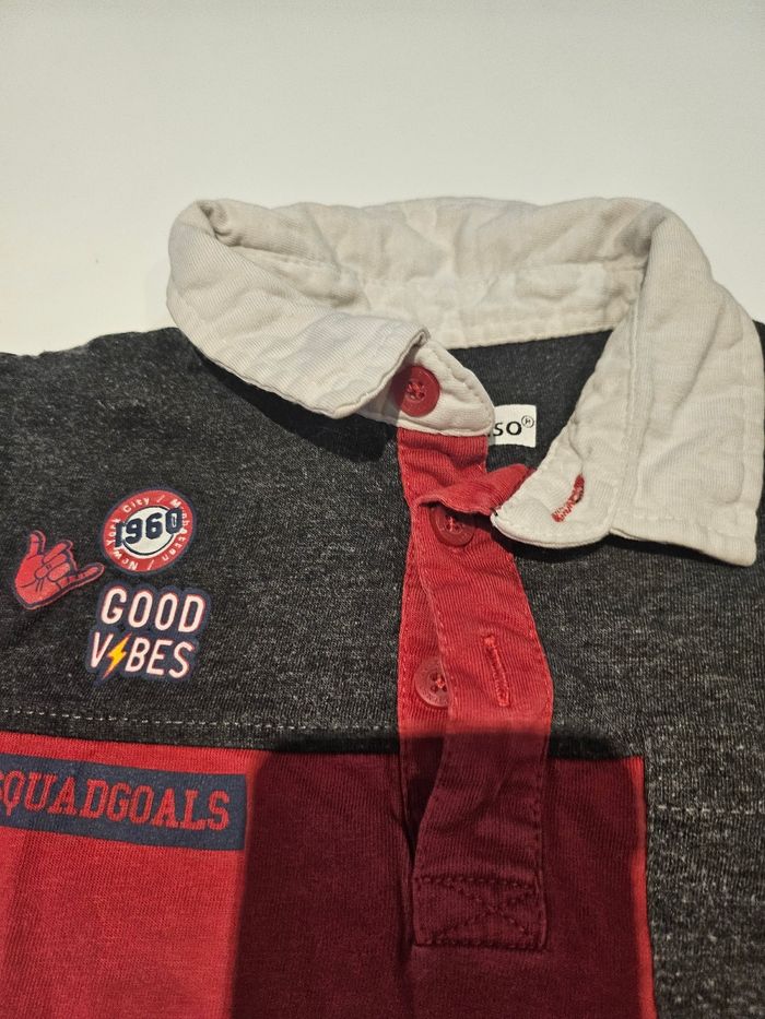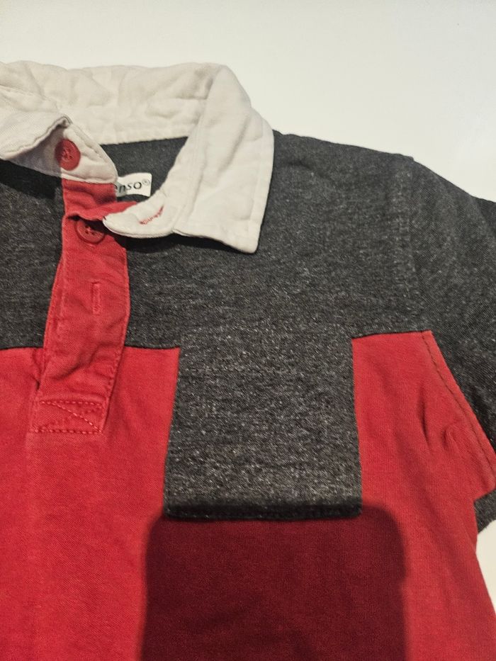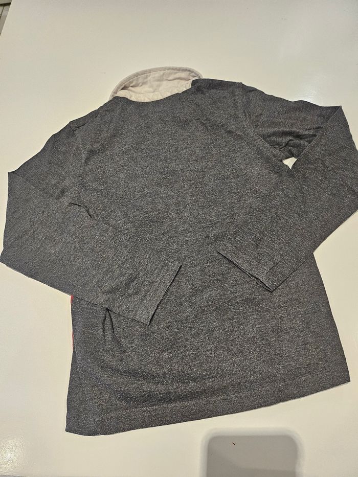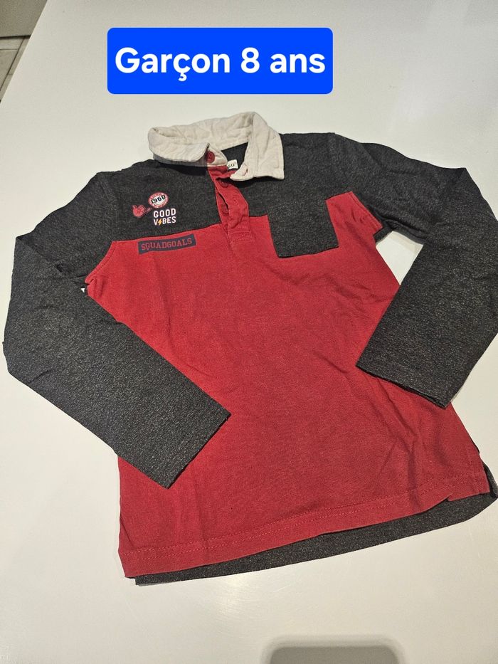 Polo manches longues gris, rouge et blanc. Petit imprimé et poche devant. Quelques bouloches. Marque : In extenso Taille : 8 ans