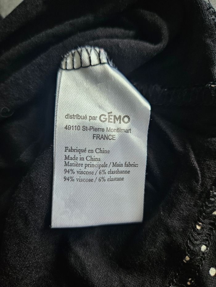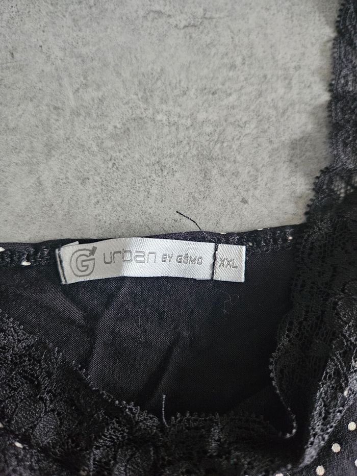 Top débardeur Avec bretelles larges Finition dentelle au col et aux bretelles Coupe femme Coloris noir Avec pois blanc Matière douce et extensible Mesures : - Aisselle à aisselle : 44cm - Hauteur totale : avec bretelles 60cm, sans bretelles, 44cm Marque : Gémo Composition : 94% viscose, 6% élasthanne Taille : XXL / 44. Voir mesures Etat : Très bon état. Peu porté Envoi ou remise en main propre