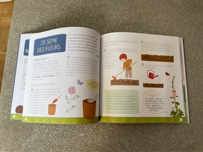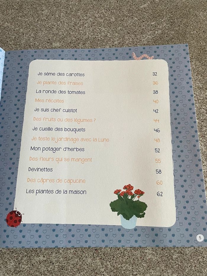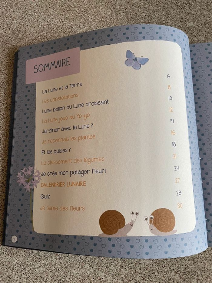 Livre Je jardine avec la lune Graine de jardinier 63 pages pour découvrir le jardinage les plantes qui se mangent..voir le sommaire ( les deux dernières photos) Plein de Quizz Plus de 60 autocollants offerts