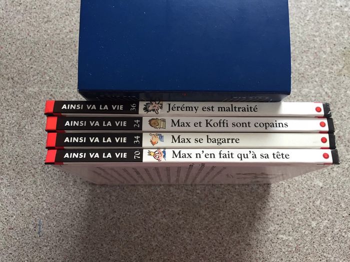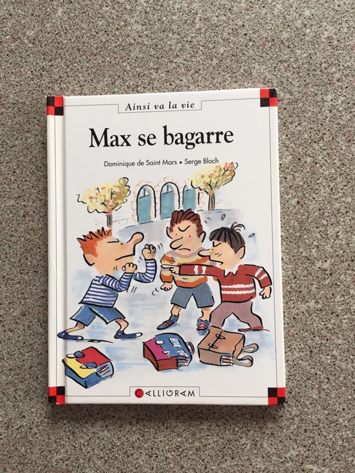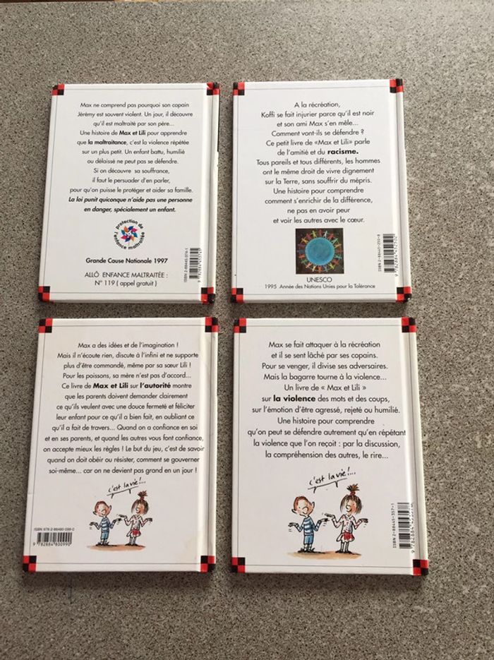 Lot de 4 livres Lili et Max Max n’en fait qu’à sa tête Max se bagarre Max et Koffi sont copains Jeremy est maltraité Très bon état juste une tache sur Max n’en fait qu’à sa tête en haut à droite voir photo Des livres très bien écrits avec des mots pour expliquer les choses de la vie Pas toujours facile de trouver les mots pour les adultes Les livres ne sont ni scotchés ni gribouillés