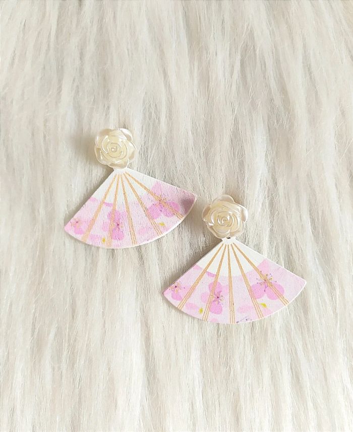 🇬🇧 Wooden fan earrings, Japanese romantic style, white and pink, lightweight, new