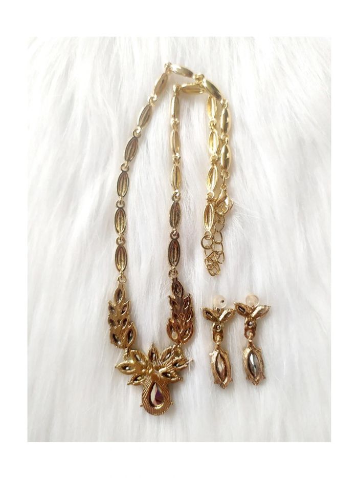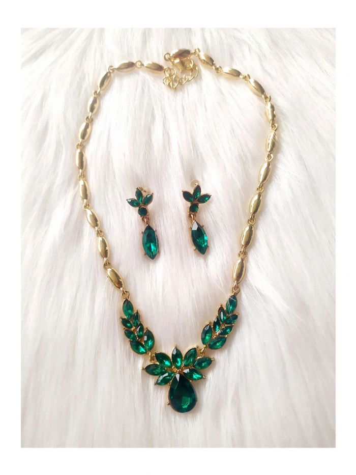 Parure dorée chic collier ras du cou et boucles vert émeraude strass style soirée gala - photo numéro 1