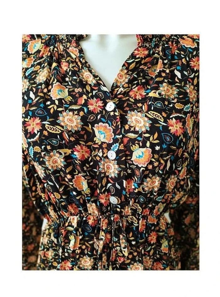 Robe manches longues col chemise à boutons évasée imprimé fleurs esprit rétro vintage années 70 boho