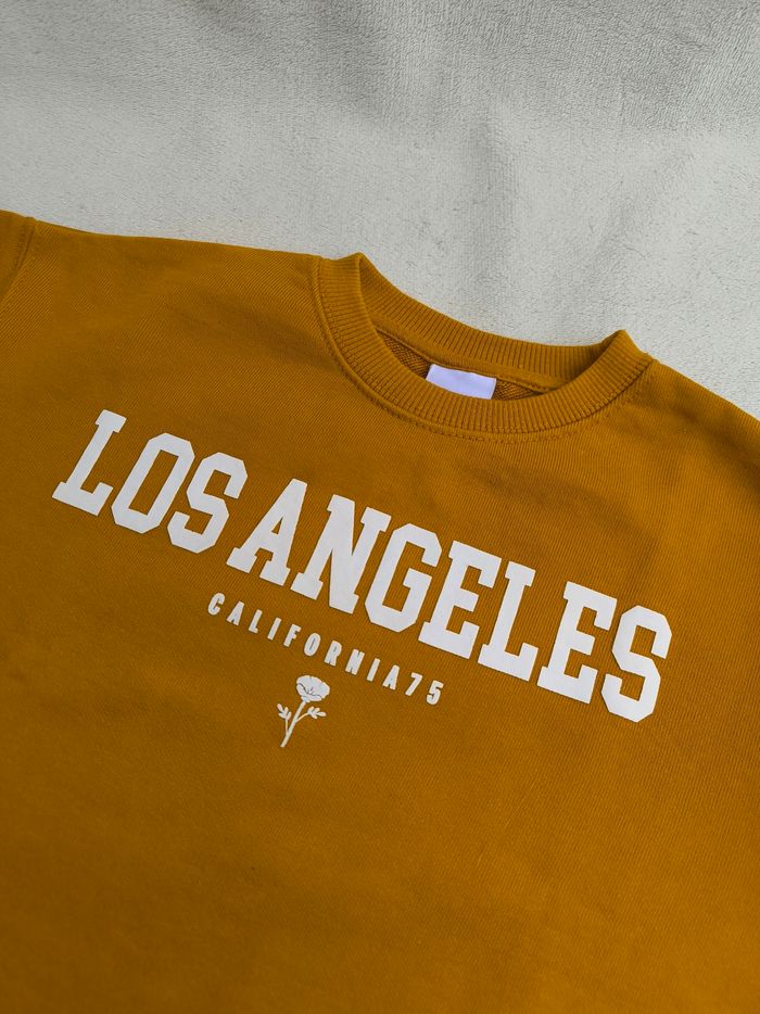 Sweat à manches longues Marque Zara Taille 6 ans, 116 cm • Coloris moutarde, blanc • Inscription "Los Angeles California 75", imprimé fleurs • Tissu fin Peu porté, en très bon état #evelyne_filles_6ans #evelyne_filles