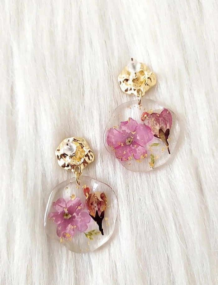 Boucles d'oreilles rondes en résine avec fleurs séchées en incrustation