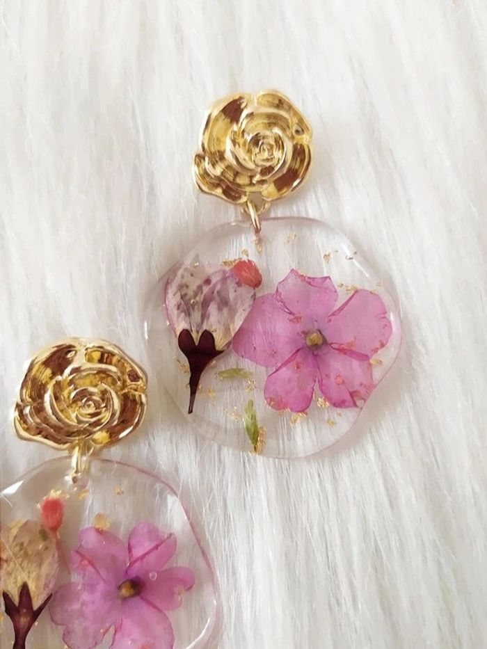 #vklbijoux Boucles d'oreilles rondes en résine avec fleurs séchées en incrustation Longueur depuis la tige 4,5 cm. Diamètre 3 cm environ. Neuves. 🌺🌺 Round resin earrings with dried inlays flowers Runde Harzohrringe mit eingelegten Trockenblumen