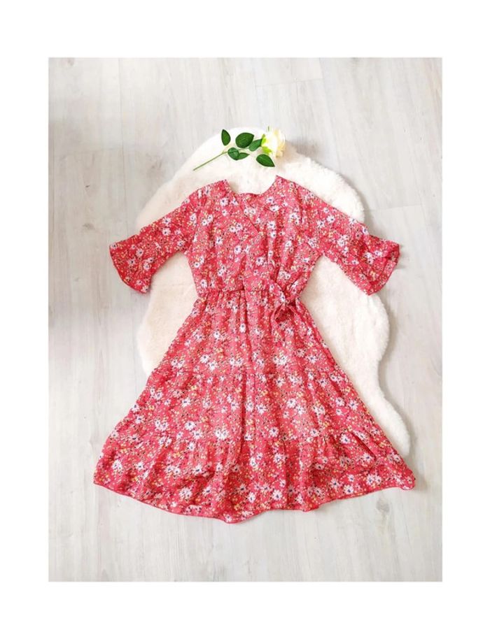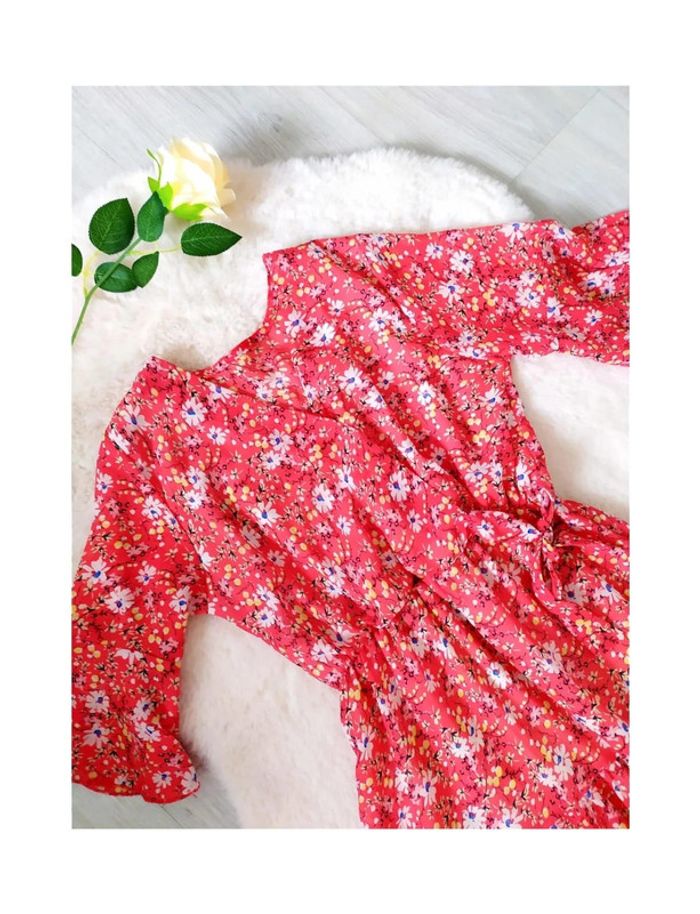 #vkl10ans Robe d'été rouge à fleurs style champêtre manches 3/4 col V faux cache-coeur Largeur épaules à plat 30 cm, aisselles 39 cm. Longueur 80 cm. En voile polyester. 🌺 Red floral summer dress country style 3/4 sleeves V-neck faux wrap Rotes Sommerkleid mit Blumen, Landhausstil, 3/4-Ärmel, V-Ausschnitt, Falsche-Wickelkleid