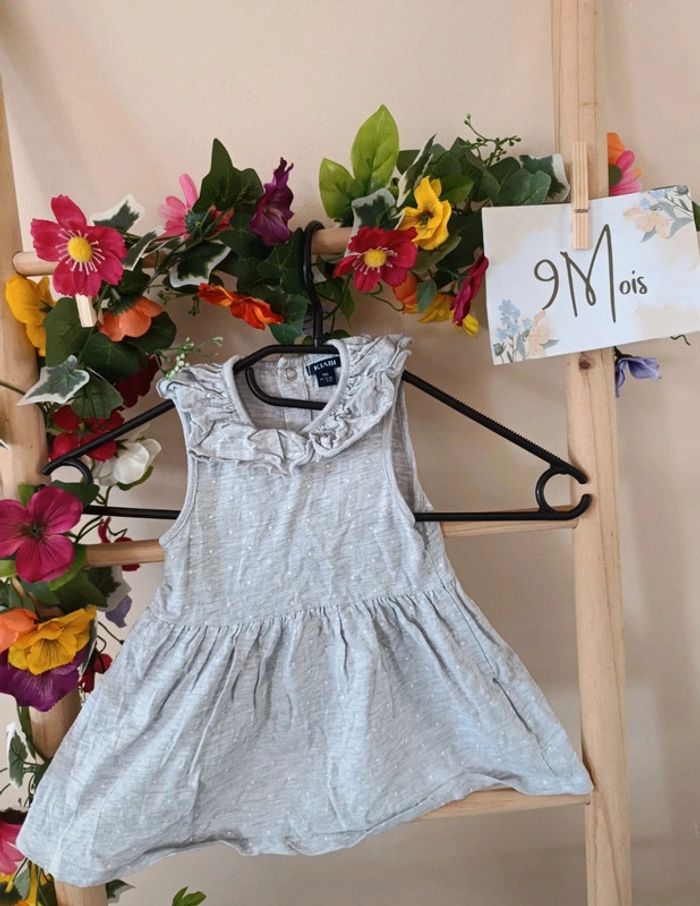 ✨ Dressing trier dans " à propos" 🌺 Marque : Kiabi 🌺 Taille : 9 mois 🌺 Robe grise, manche courte, légère #deborahcog_9moisfille