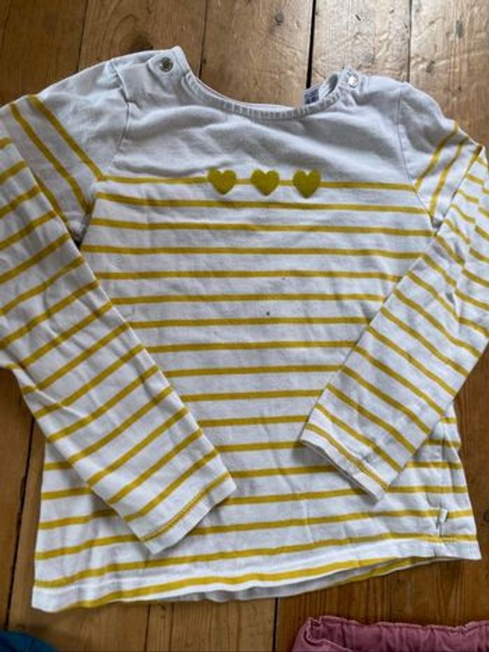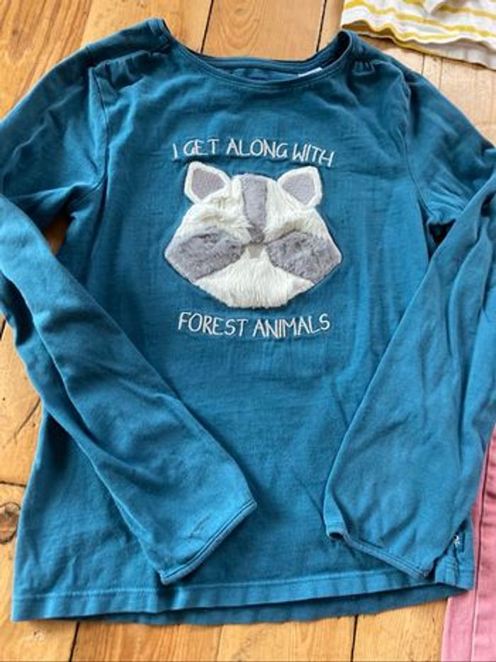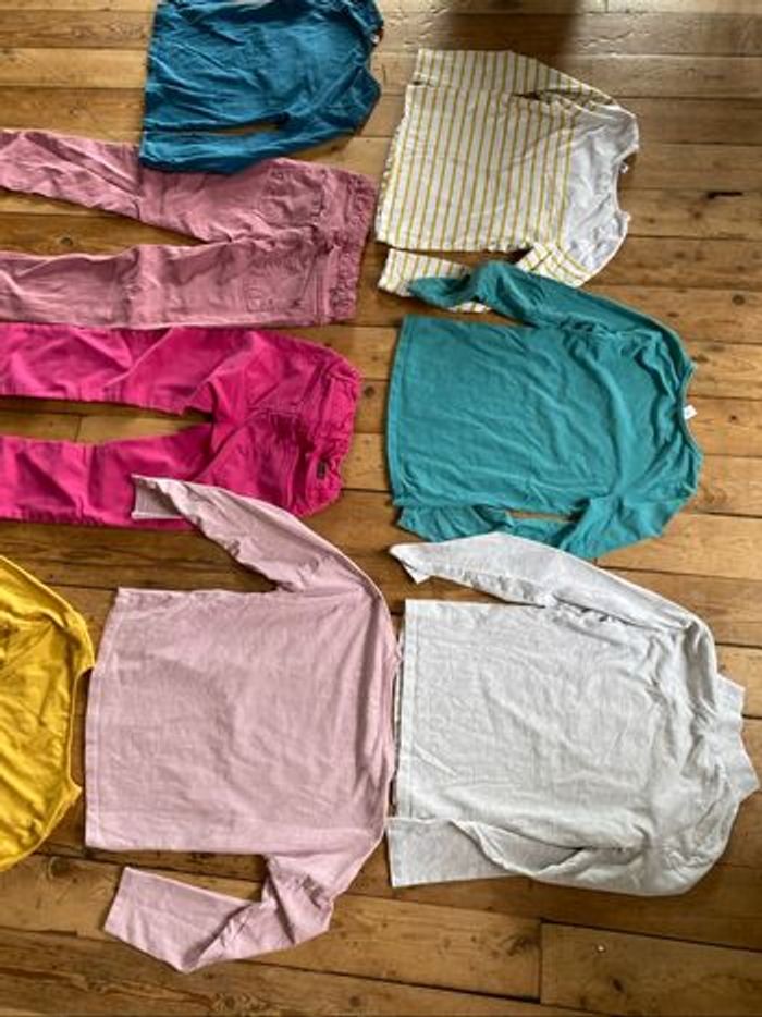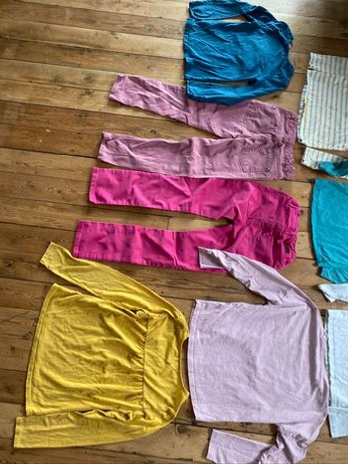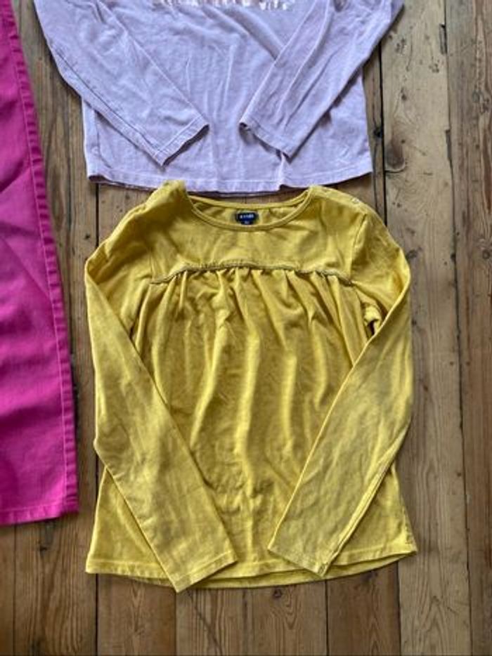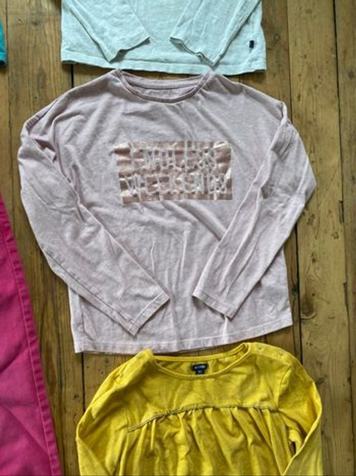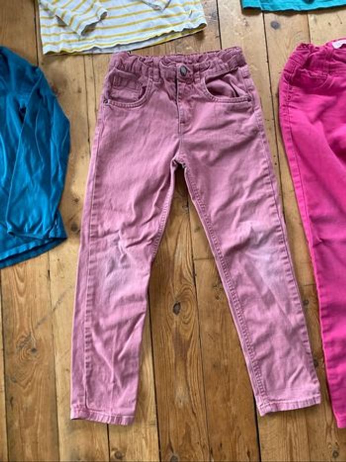 Lot 8 et 10 ans t-shirts pantalons : Pantalon vieux rose réglable à la taille 8 ans 128 cm Lili Marelle, blanchi sur les genoux et petit trou sur un mollet derrière Pantalon slim fuschia réglable à la taille 8 ans 126 cm Okaidi 2 petits points de stylo sous une poche devant T-shirt vert canard animal fourrure 8 ans 128 cm Okaidi taches noires au poignet T-shirt vert Flowers 8 ans 128 cm Okaidi, 2 micros trous sur une manche T-shirt rayé jaune 8 ans 128 cm Okaidi, plusieurs petites taches devant T-shirt rose 10 ans Gémo, un peu de fines bouloches T-shirt tunique moutarde biais doré 10 ans 138-143 cm kiabi, un petit trou sur la couture de la manche T-shirt col montant 10 ans 140 cm, taches bas des manches