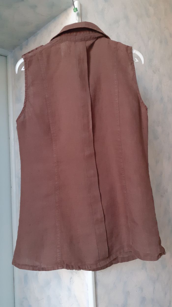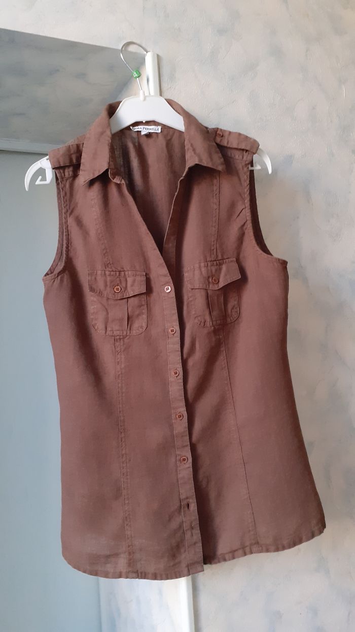 Vends un chemisier un peu cintré, sans manche, en coton et lin, 2 poches devant, épaulettes, couleur marron, marque Emma Pernelle, taille 42 sur l'étiquette mais petit. Longueur de l'épaule à la base : 66 cm Largeur aisselle à aisselle : 45 cm Largeur au niveau des hanches : 48 cm.