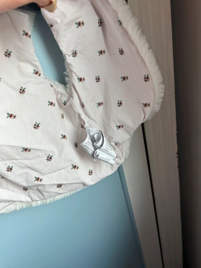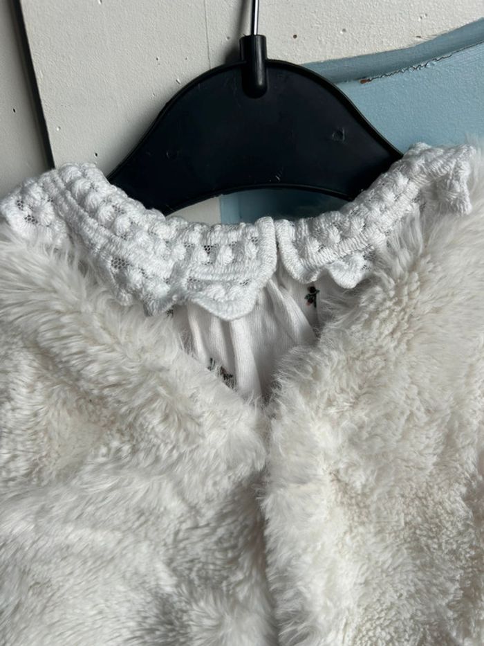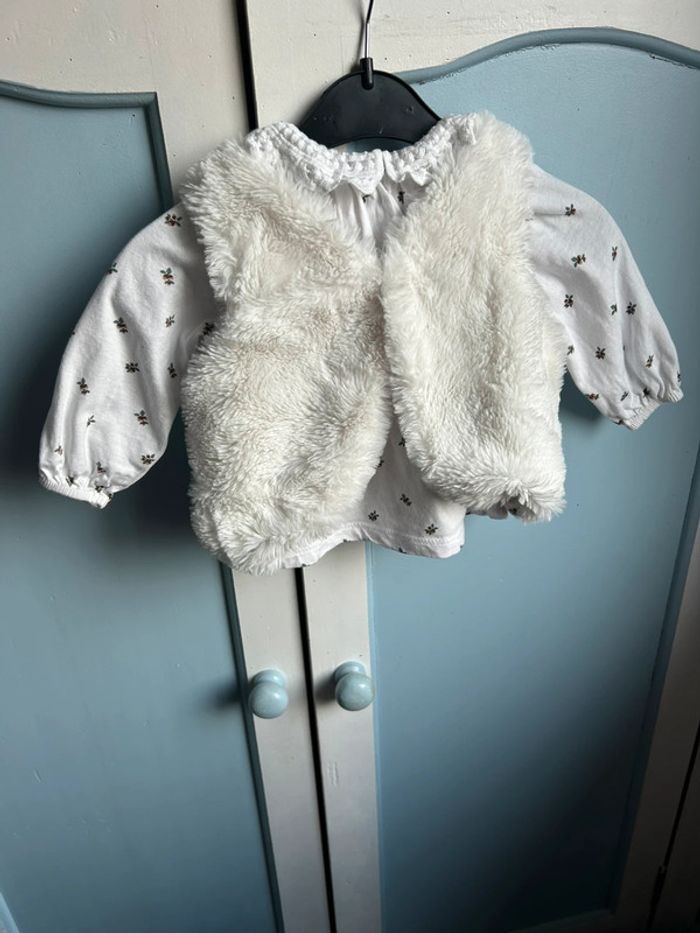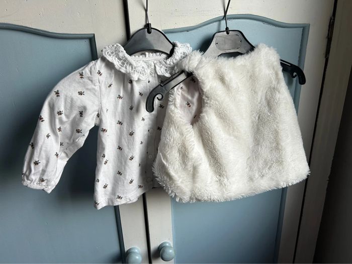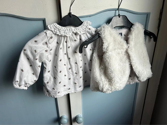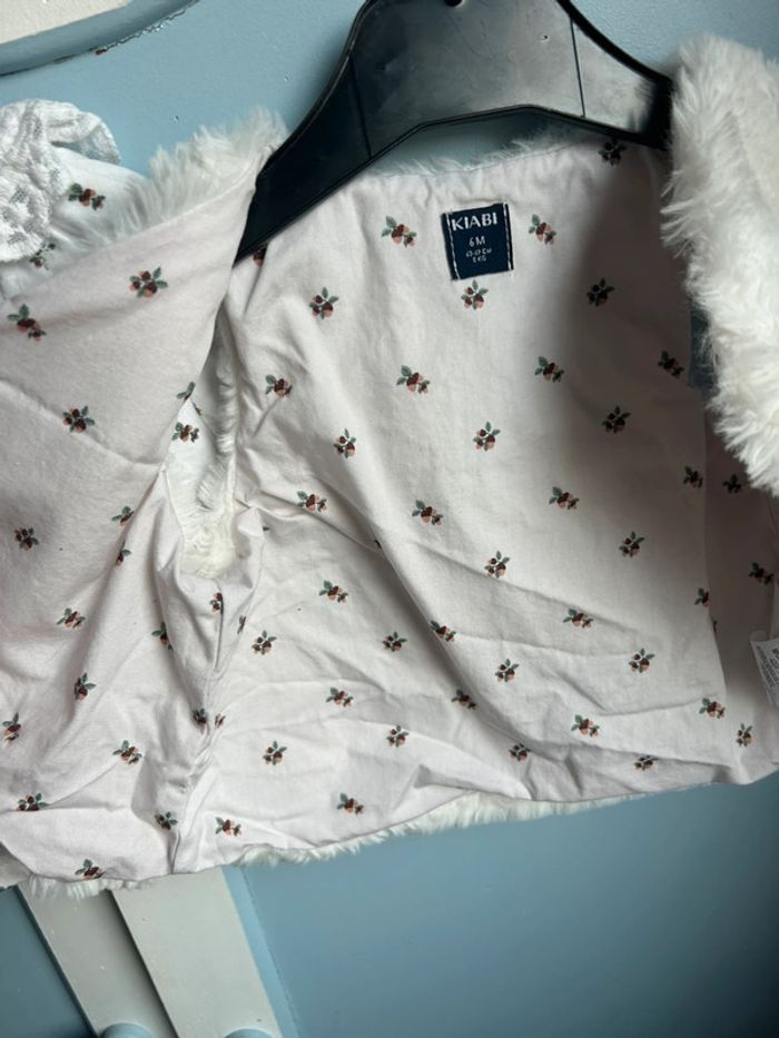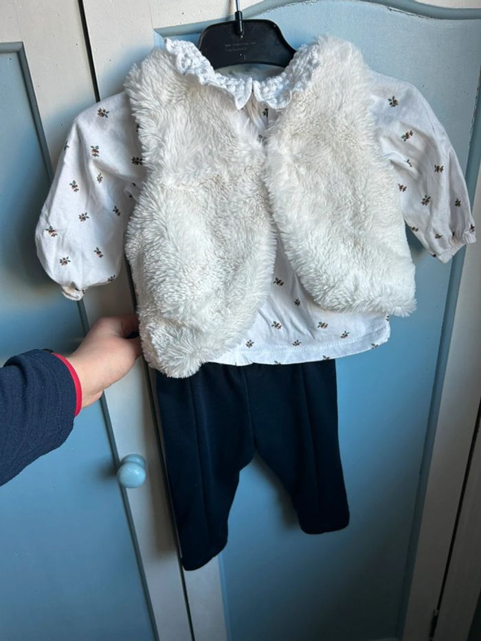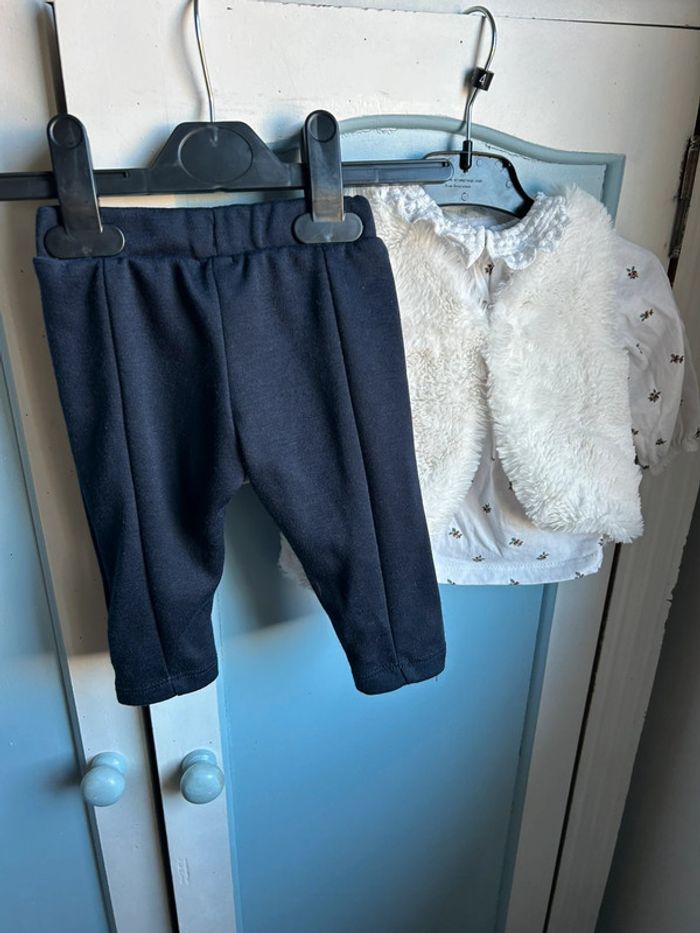 Ensemble 3 pièces , pantalon marine , haut avec col en dentelle , motif feuille , veste fausse fourrure avec à l’intérieur le motif feuille,6 mois , neuf sans étiquette jamais porté juste lavé , encore à 20€ à kiabi #aurore90bebefille6mois #ensemble3pieces