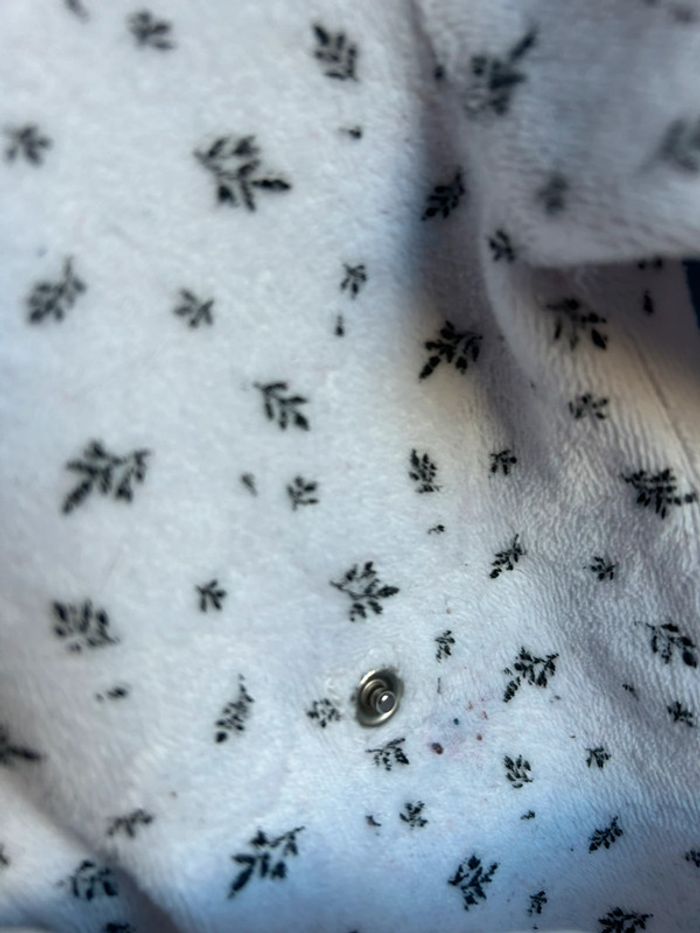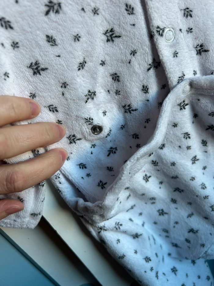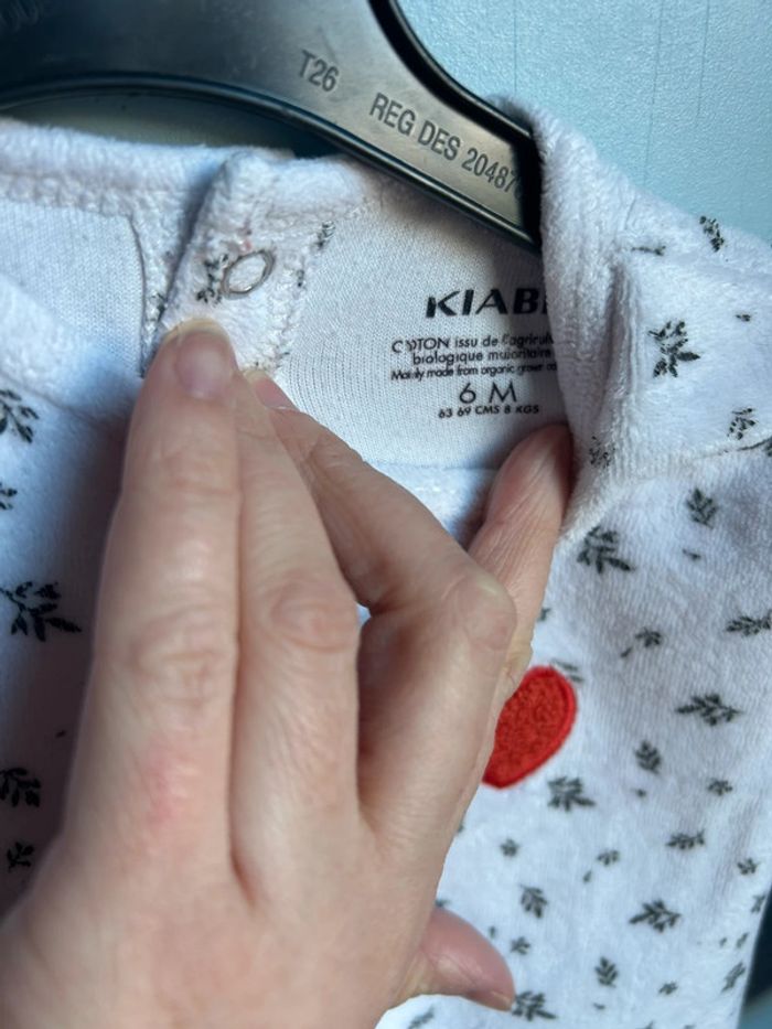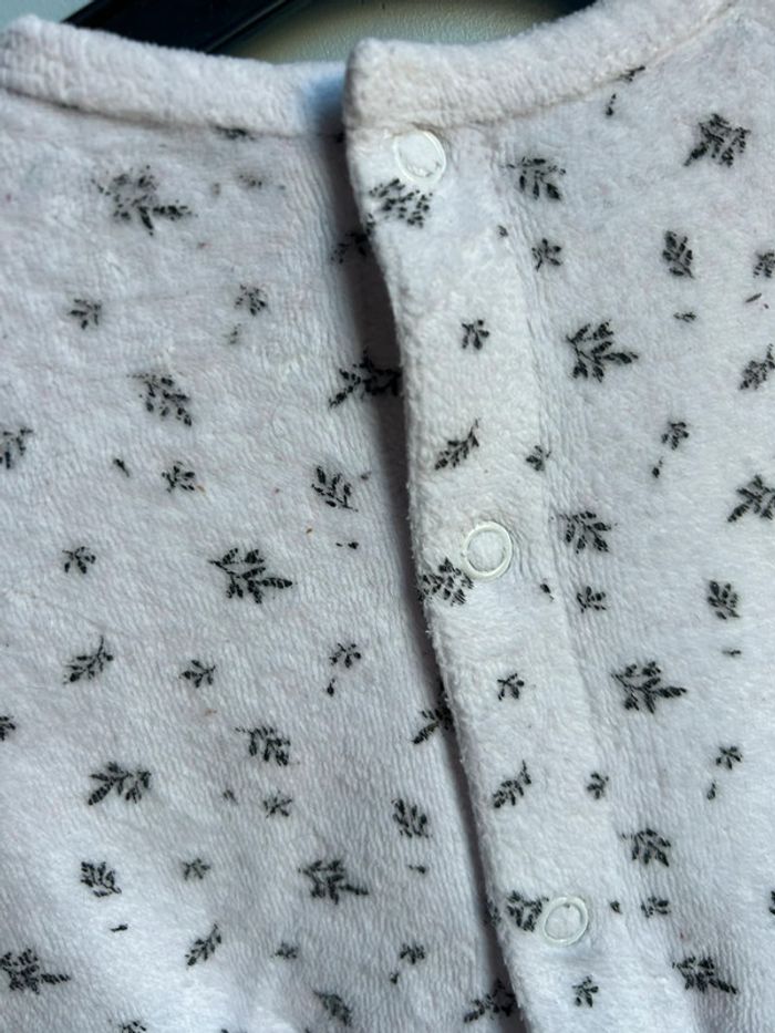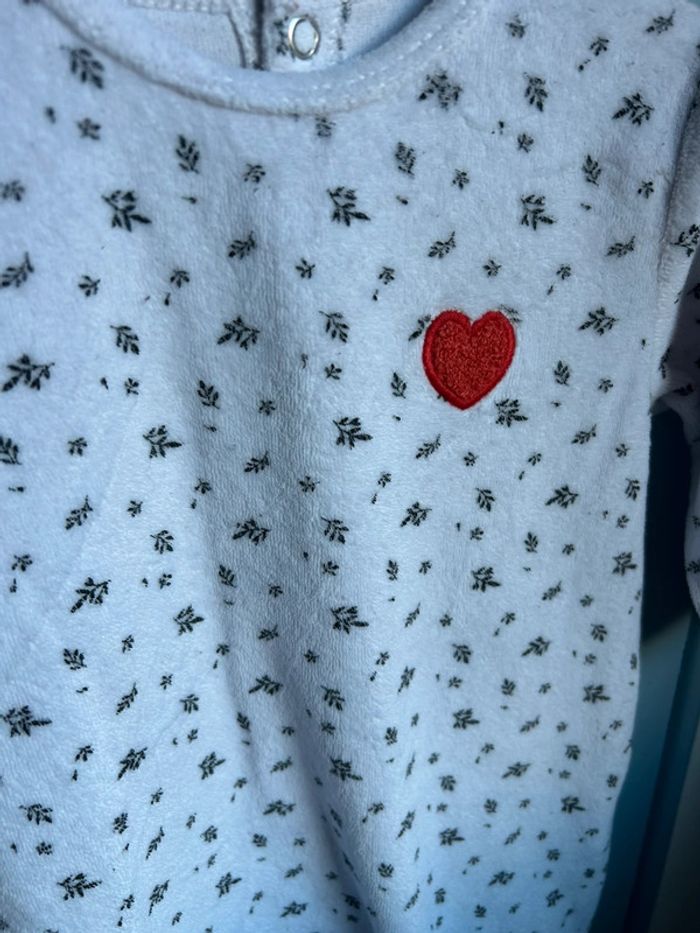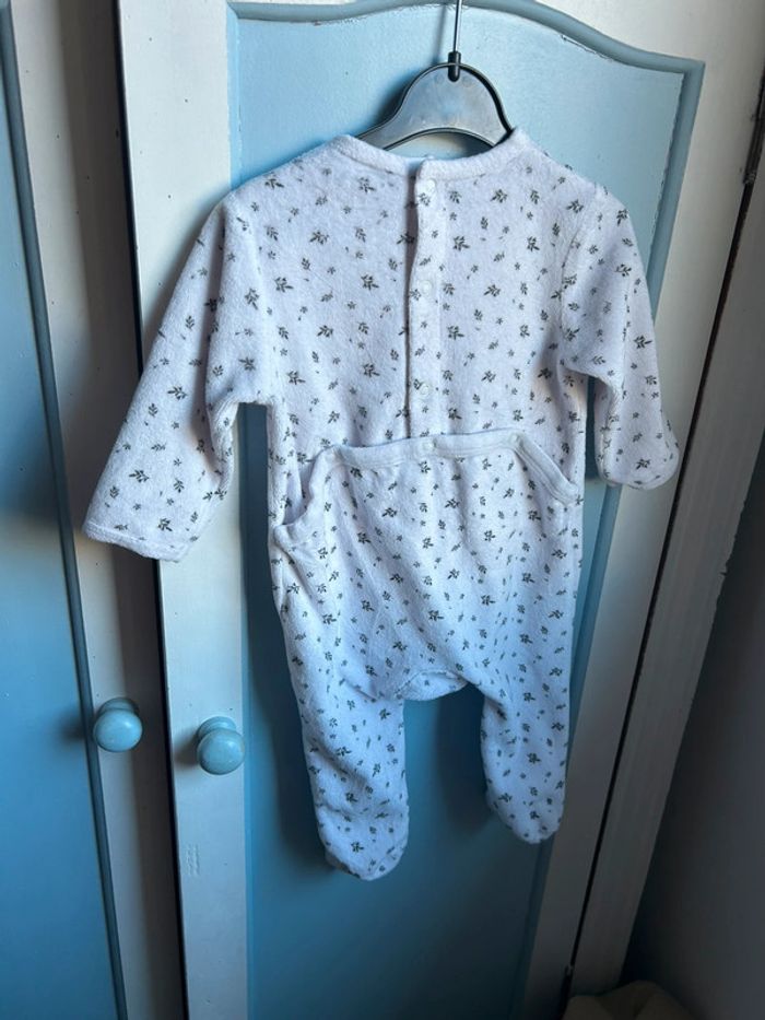 Pyjama velours kiabi, blanc avec des feuilles noires, petit cœur sur la poitrine, ouverture par pressions dans le dos, kiabi, très bon état, 6 mois #aurore90bebefille6mois #pyjamahiver