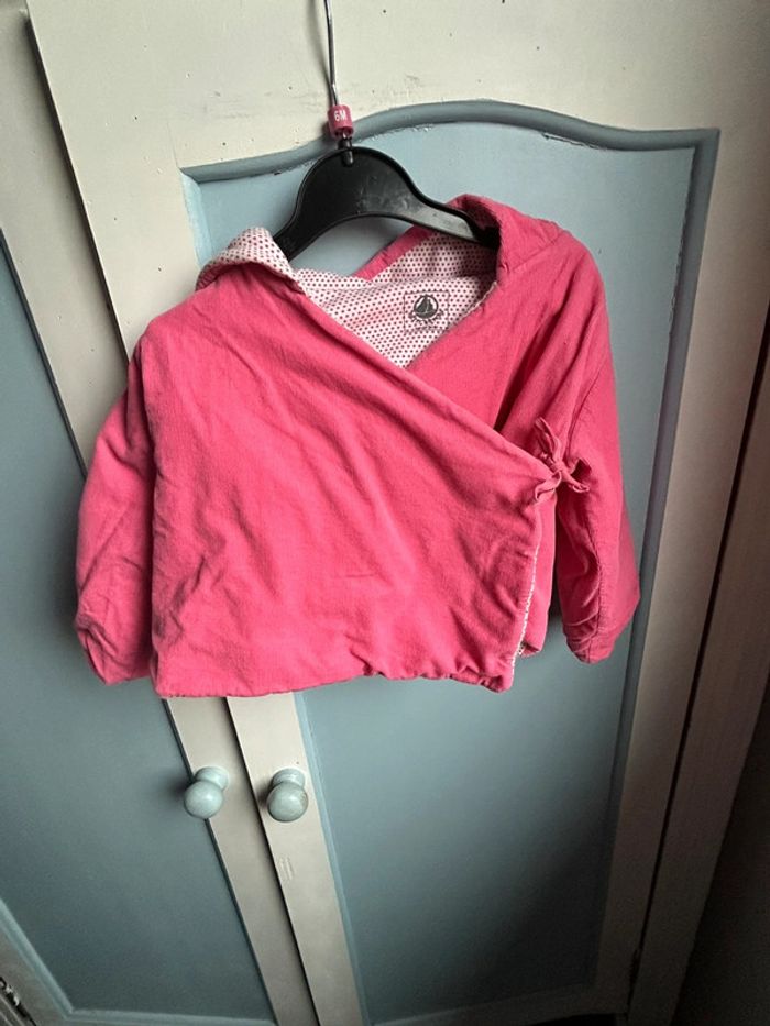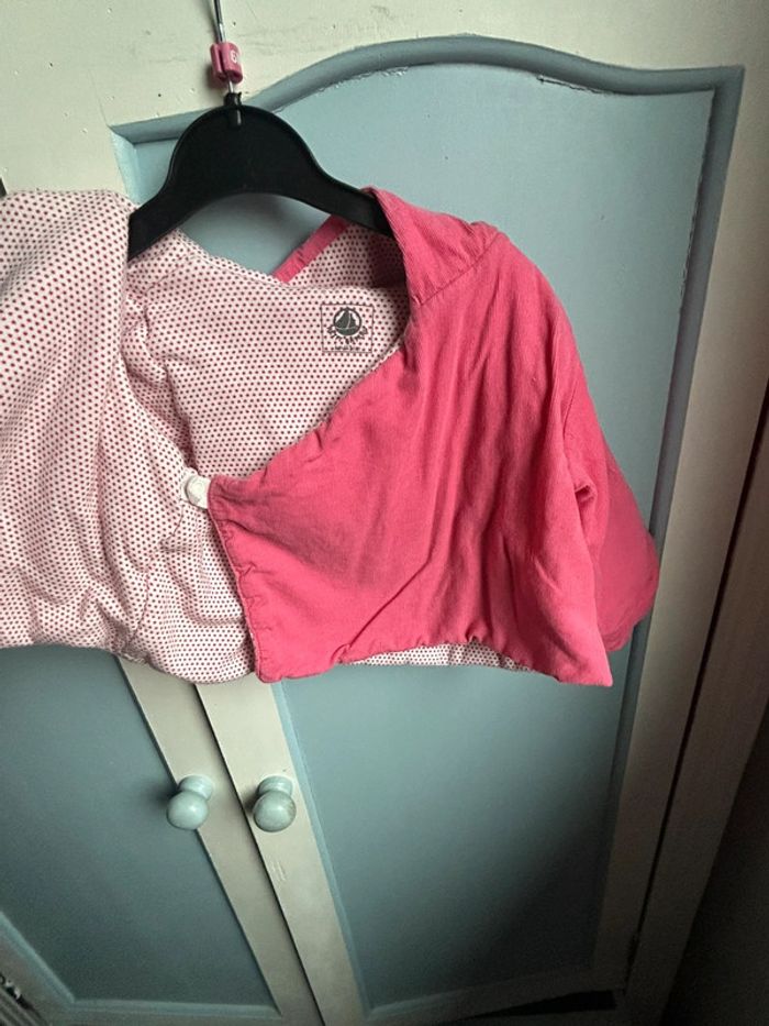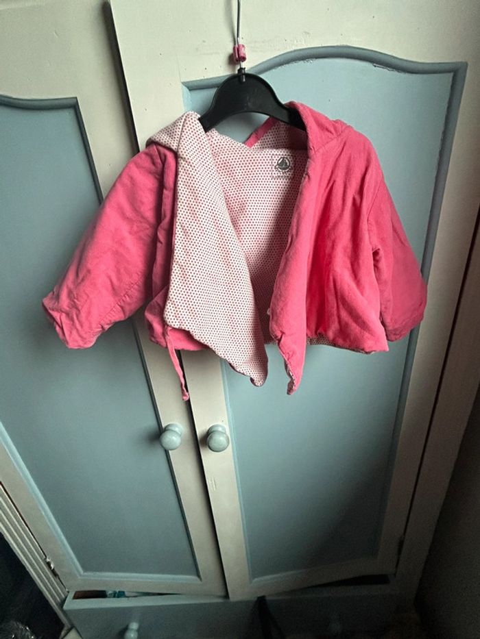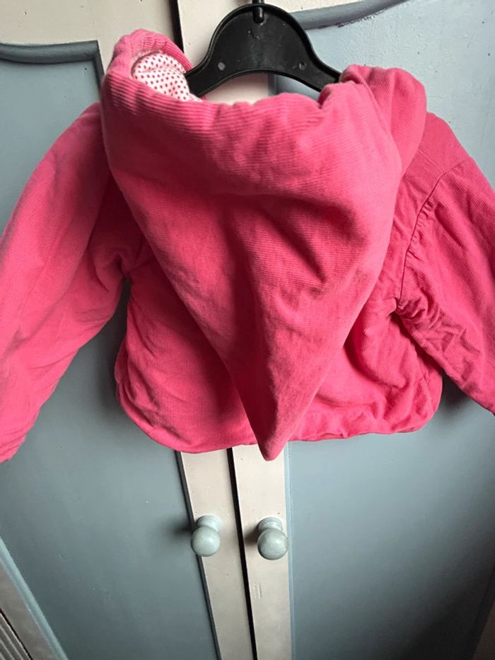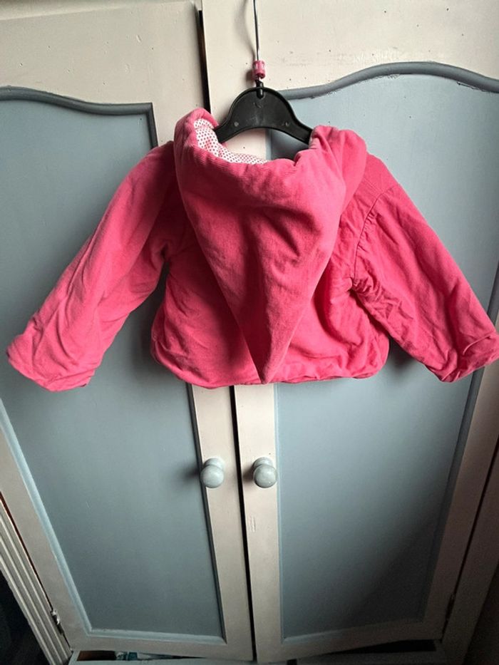 Veste avec capuche , épaisse, velours à l’extérieur, petit bateau, rose , intérieur , blanc à pois rose , très bon état, 6 mois #aurore90bebefille6mois #veste #petitbateau