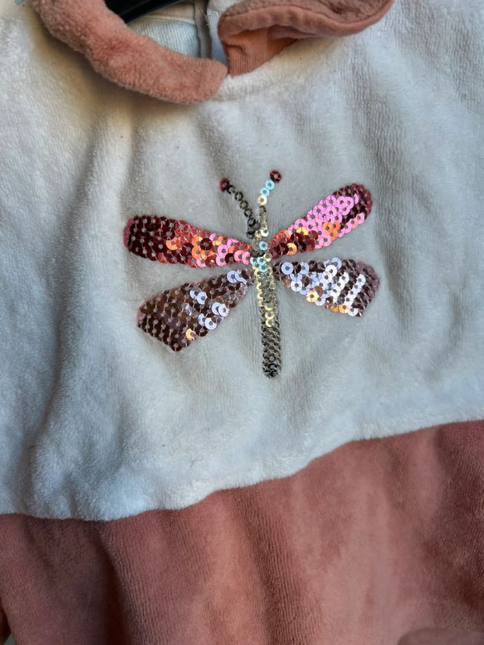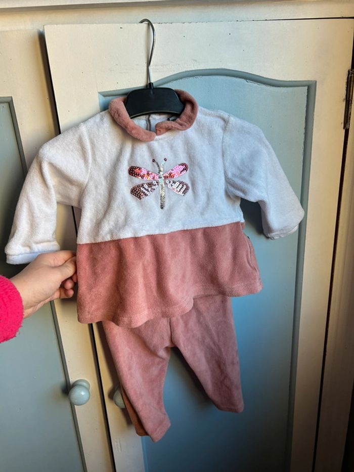 Ensemble velours, rose et blanc, avec libellule en sequins, très bon état, marque plus , 6 mois #aurore90bebefille6mois #libellule
