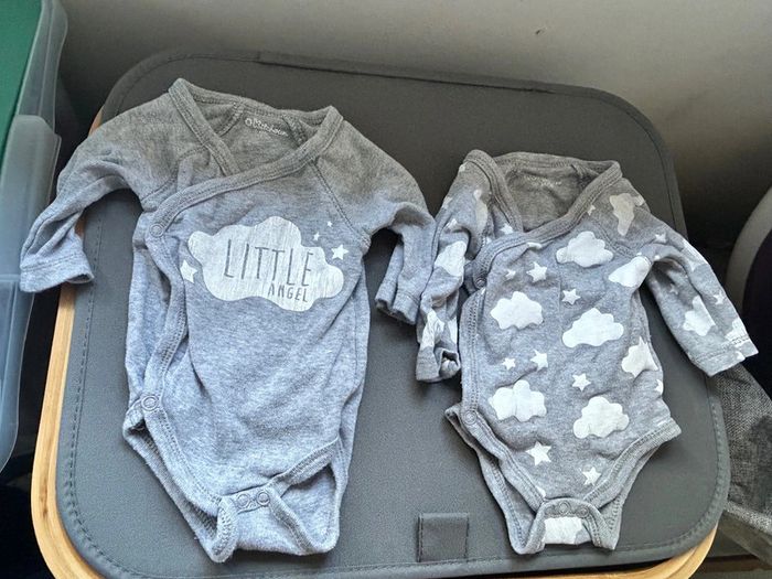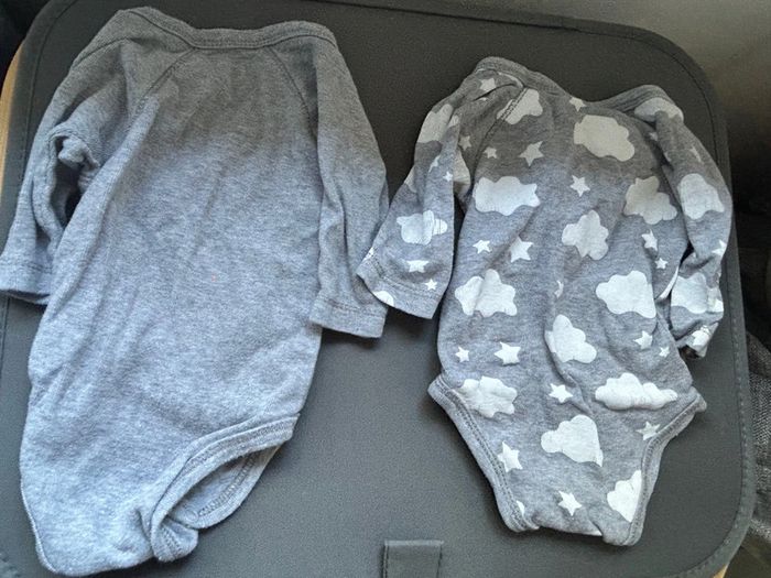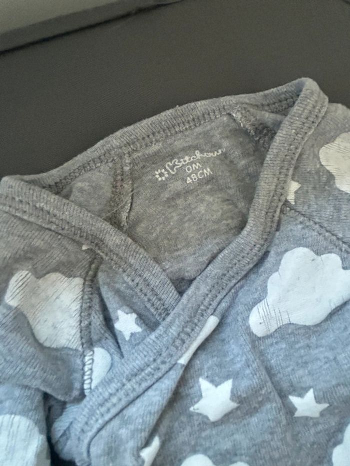 Lot de 2 bodys , kitchoun , très bon état , juste le dessin craquelé , gris, motif nuage et little Angel , taille naissance #aurore90bebenaissance #body