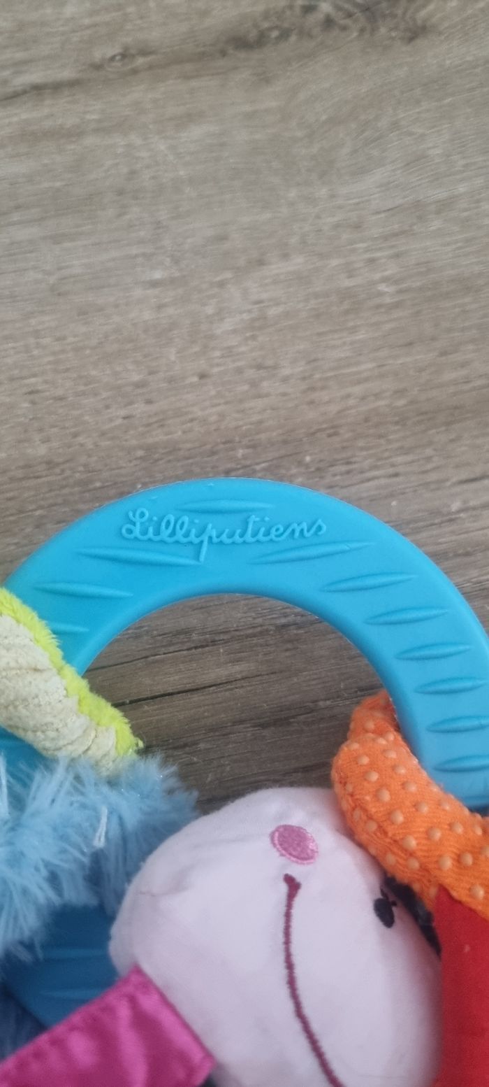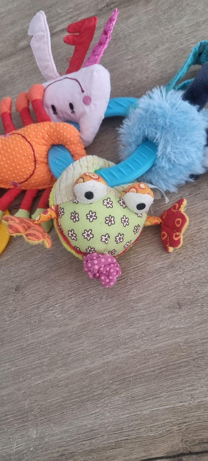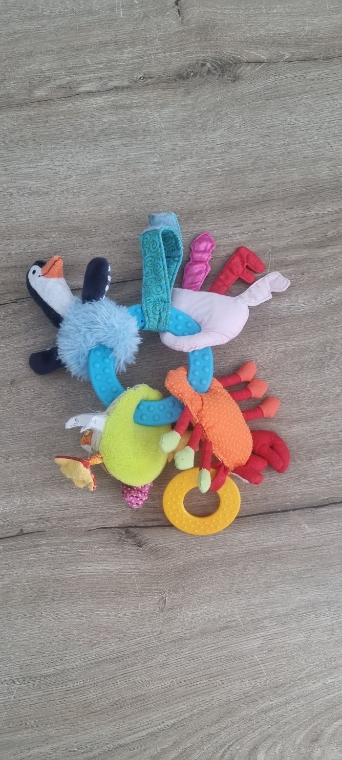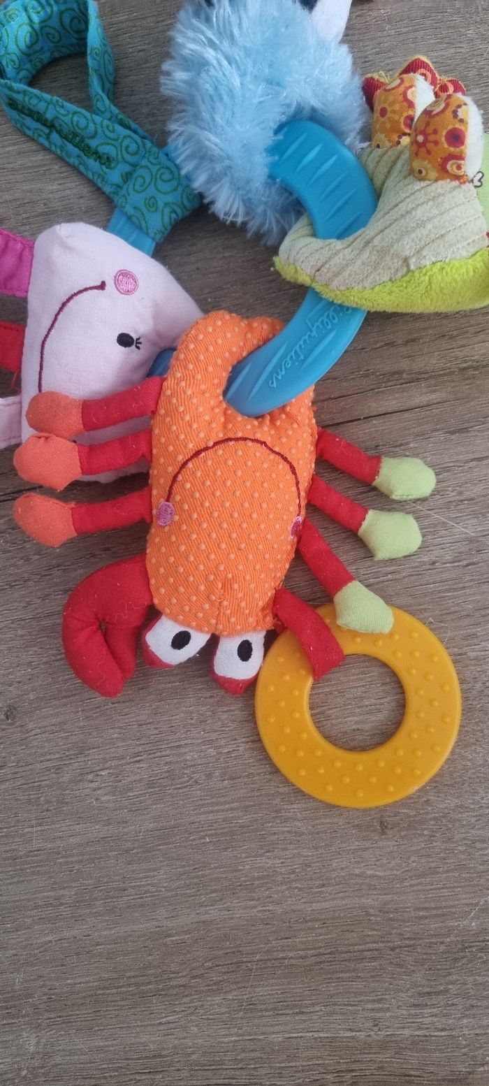 Hochet en tissus trousseau de clés des amis de l'eau, peut être suspendu Anneau de dentition et 5 animaux : - Anouk le pingouin qui fait pouet pouet - Roméo, le crapaud qui vibre en tirant sur sa langue - Oscar, le crabe qui est un hochet avec anneau de dentition - la pieuvre fait le bruit du papier Lilliputiens Très bon état