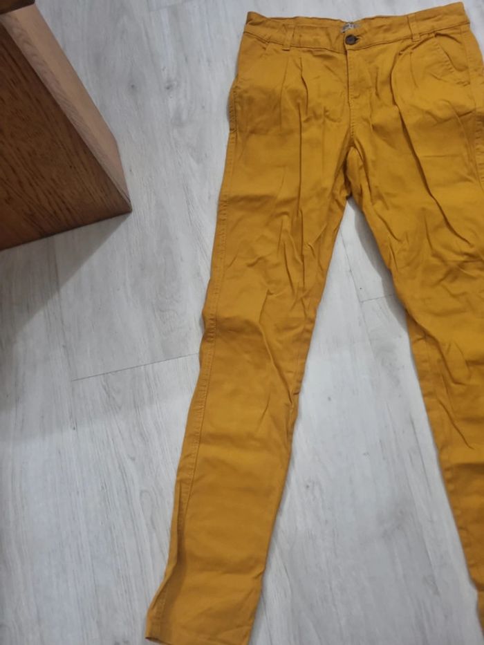 Pantalon chino moutarde, 36, ligne à suivre, tout coton. Légères tâches sur le bas des jambes #somara66femme36