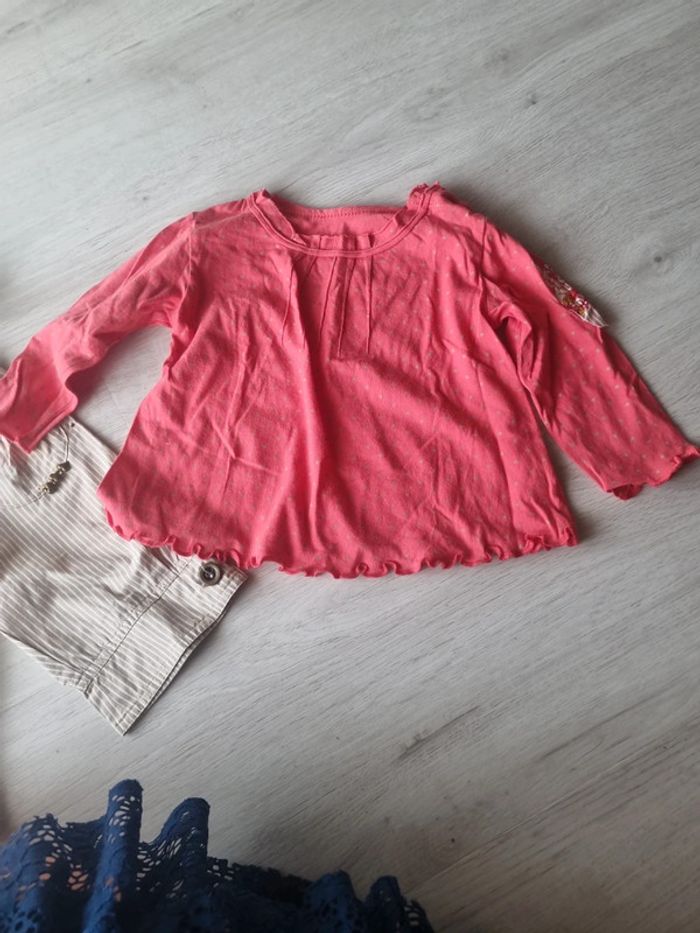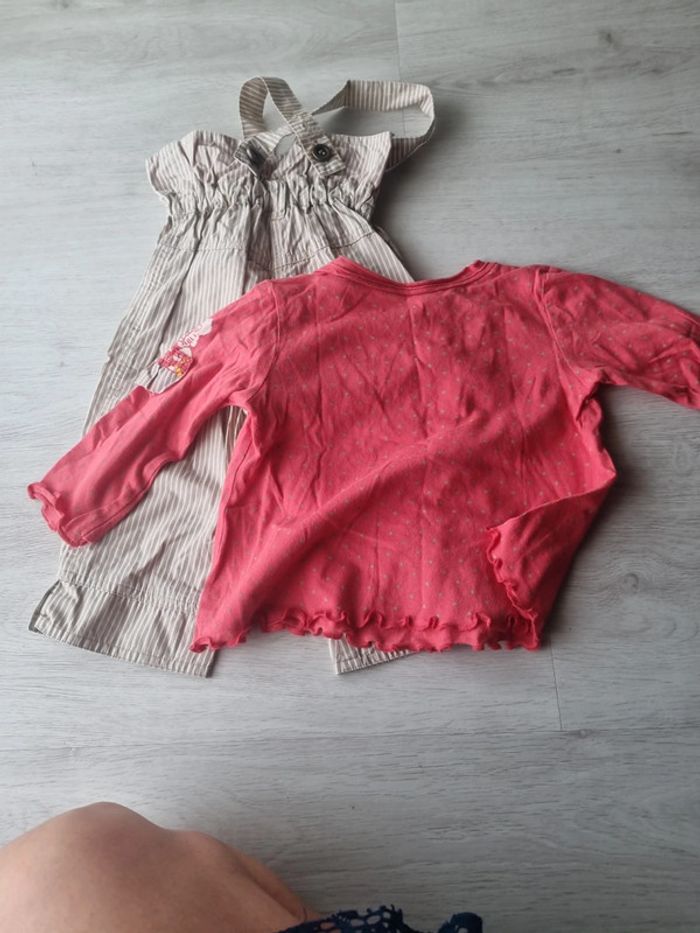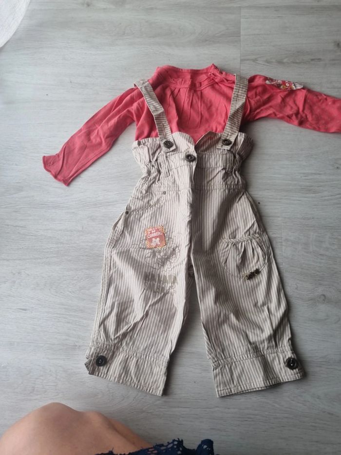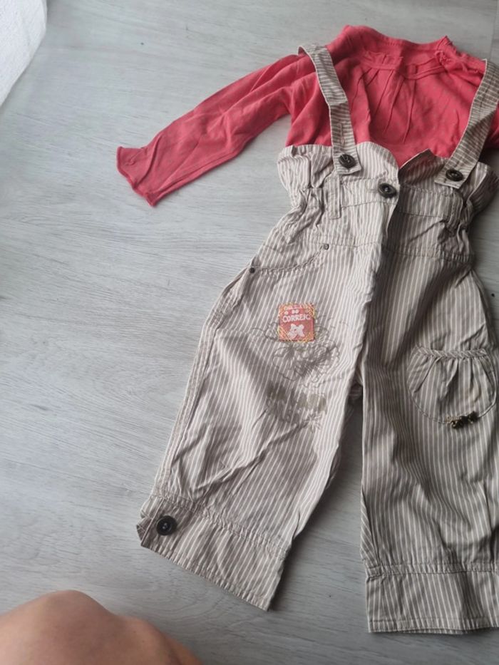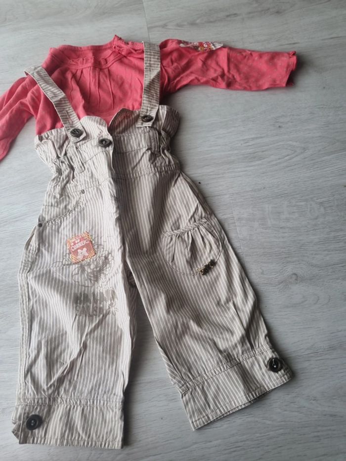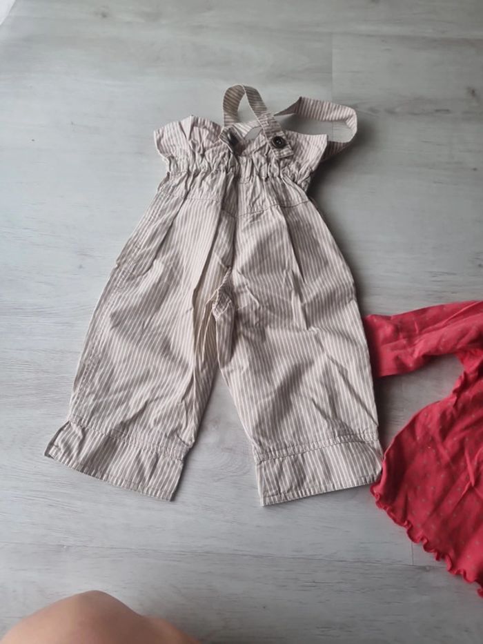 Ensemble marese composé d'un Pantalon taille haute à bretelles rayé beige et blanc et un tee-shirt manches longues avec rapoel du tissu du pantalon sur la manche, petite couture dans le dos à la place de l'etiquette 12 mois #somara66fille12mois