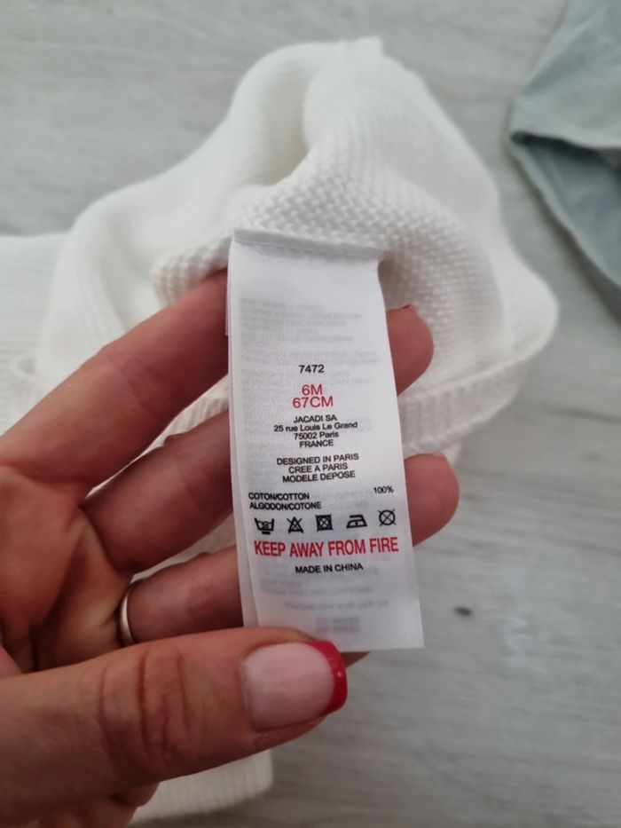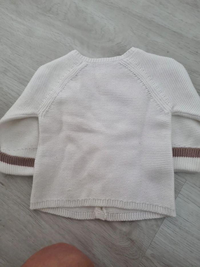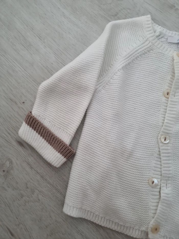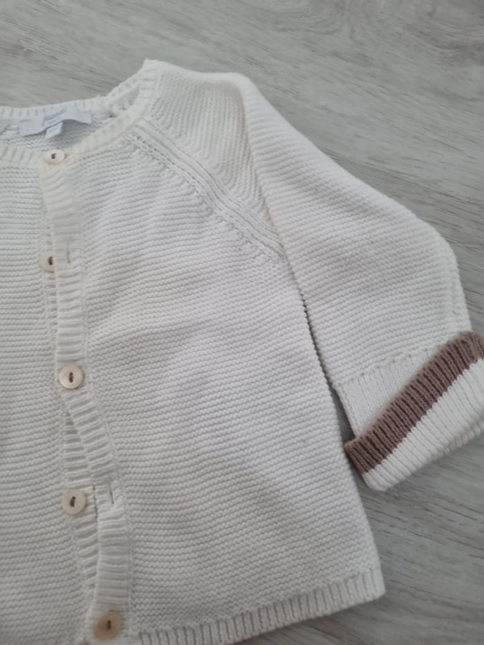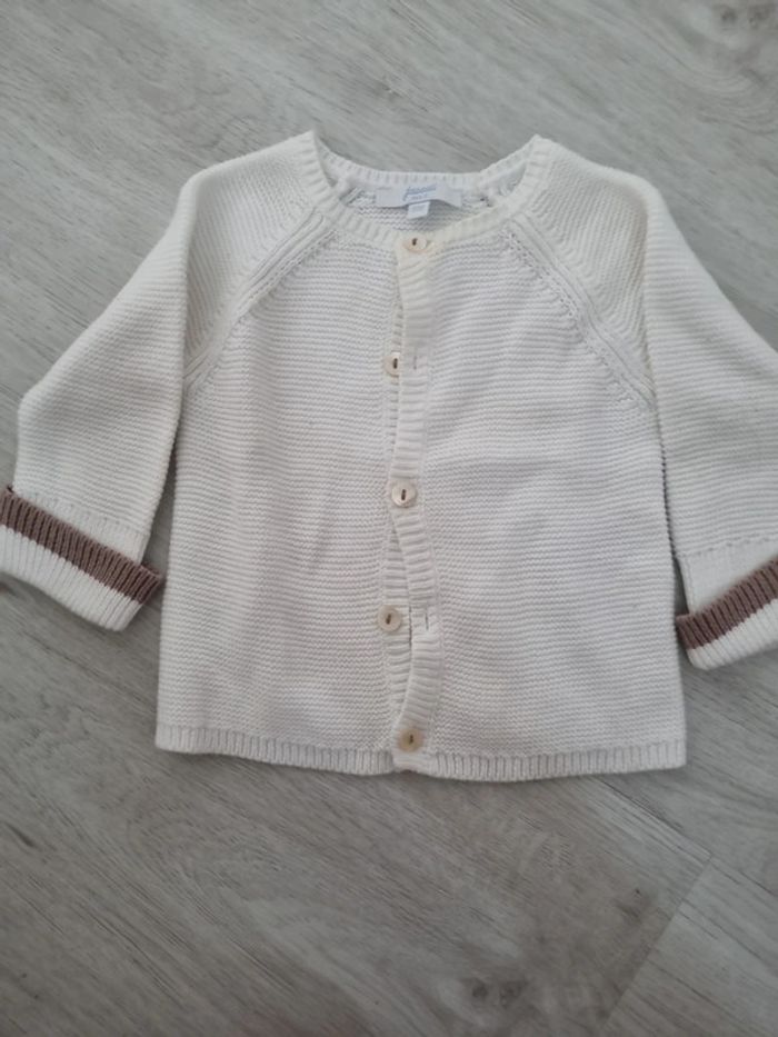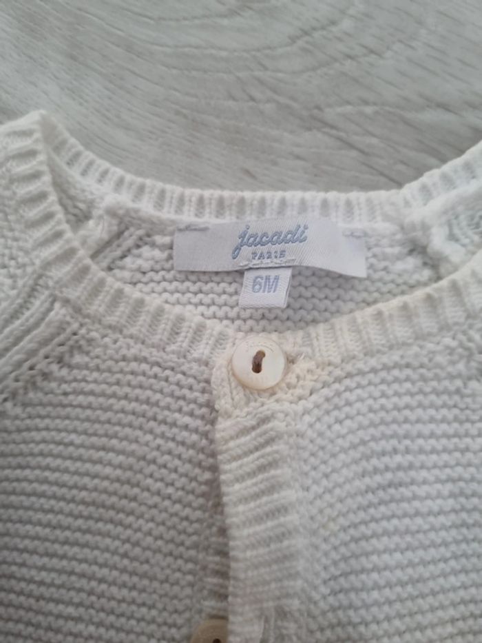 Gilet crochet jacadi, blanc avec liseré beige aux manches, boutons, 6 mois, légèrement jauni au col #somara66garcon6mois