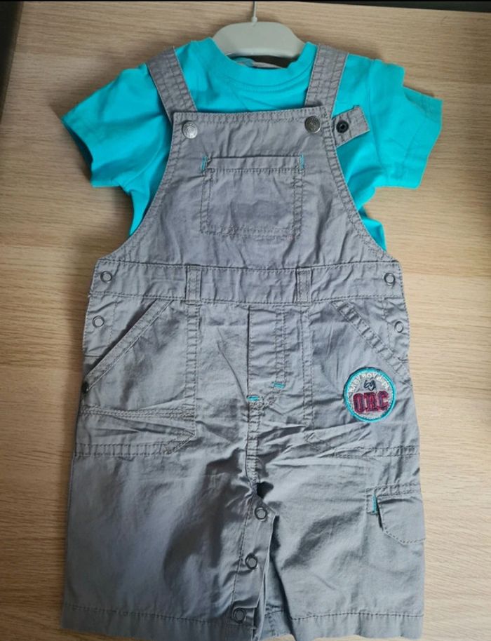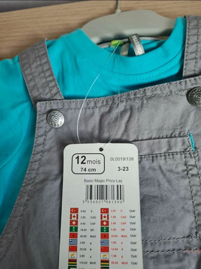 Ensemble salopette grise et polo bleu turquoise garçon Orchestra taille 12 mois neuf avec étiquette