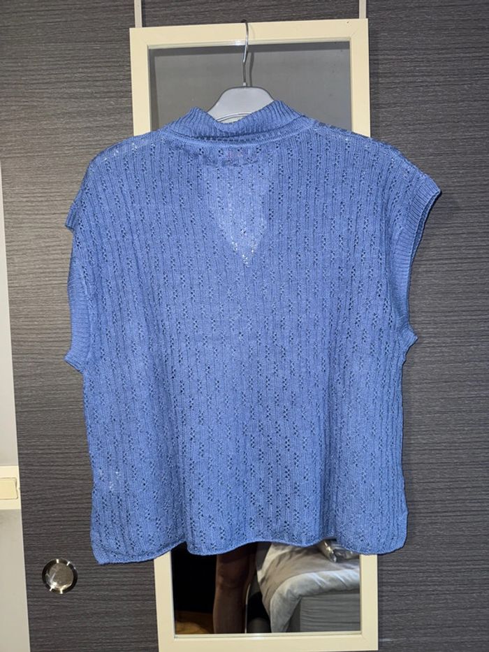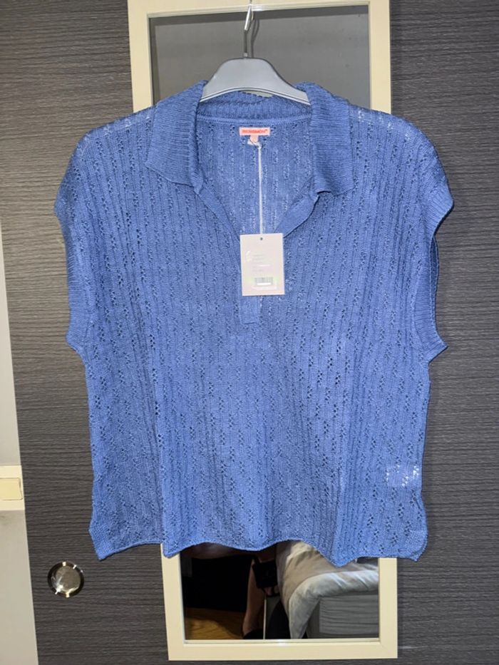 Le Pull modèle : Ludo est un t-shirt à manches courtes 100 % lin recyclé. col à patte polo avec une encolure en V . Les fentes sont au bas des côtés et le point maille est fantaisie. Taille L Valeur : 150 €