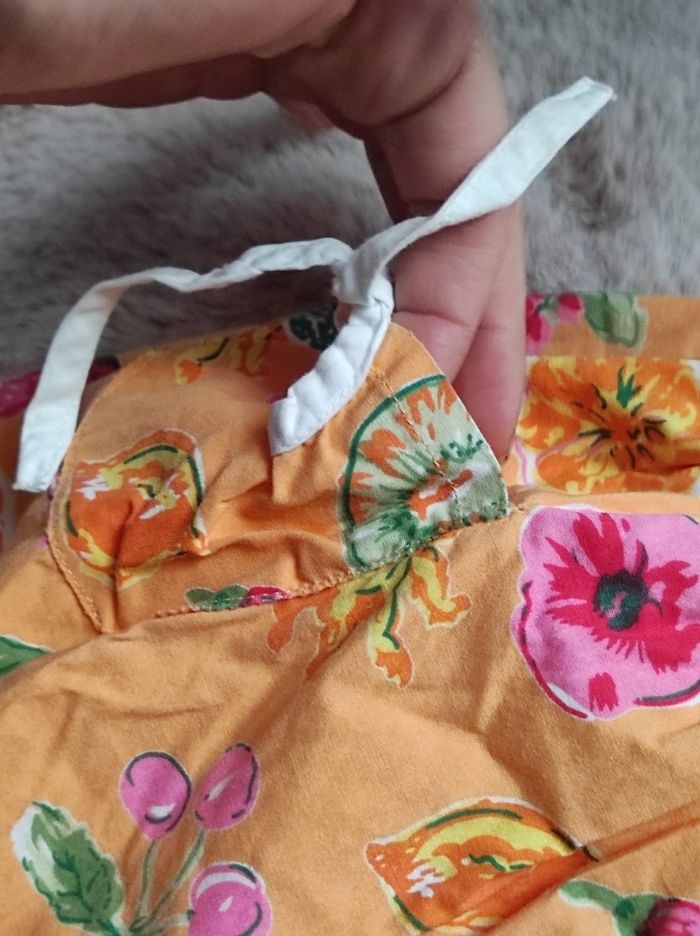 Magnifique robe orange imprimé vintage ( oui je l'ai portée il y a plus de 30 ans ainsi que mes nièces et filles ) et elle est en très bon état. Ni trous tâches ou déchirures, a très bien été entretenu. Sans manches, ouverture a boutons, deux poches sur le côté, très légère . 100% coton. Taille 3 ans.