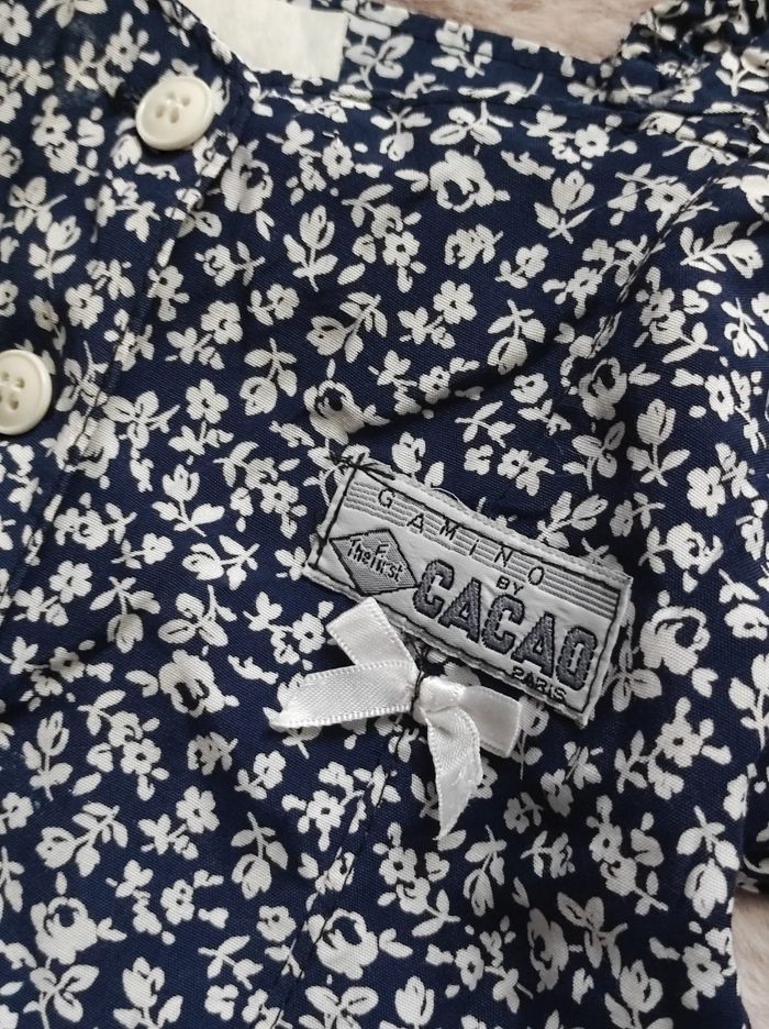 Magnifique robe fleurie vintage ( je l'ai portée il y a plus de 30ans ) et elle est en très bon état. Ni trous tâches ou déchirures, a très bien été entretenu. Épaules à manches courtes et demi dénudées ( les bretelles ont été raccourcies et cousues voir la photo ). Ouverture a boutons, très légère et fluide. Le bout des manches est élastique , à l'arrière il y a un petit cordon pour affiner la taille de princesse. Marque cacao étiquette taille non visible mais c'est un 3 ans.