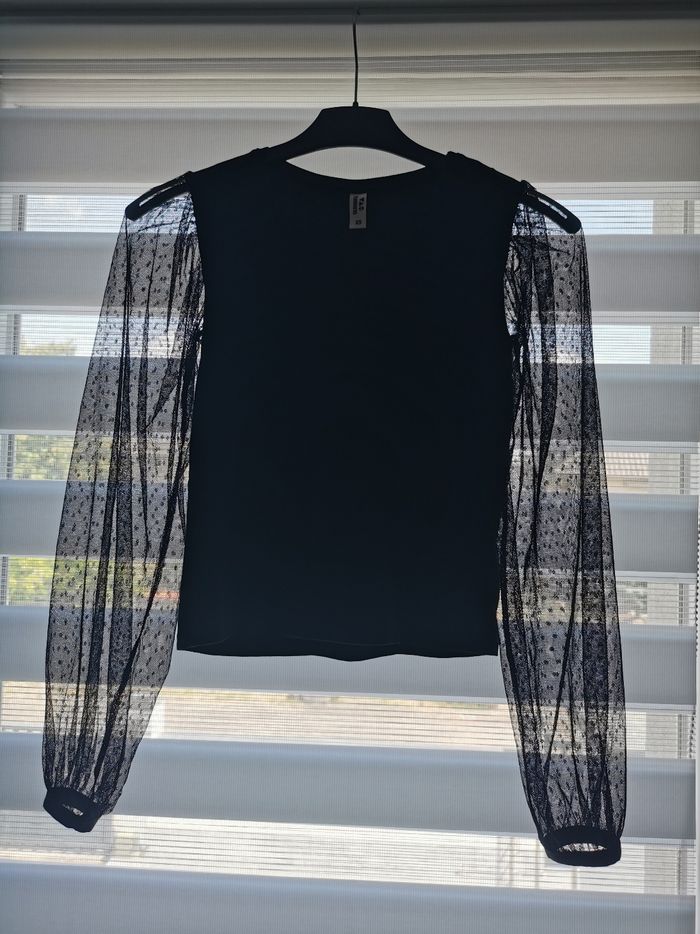 T-shirt noir taille XS avec manches transparentes à pois.