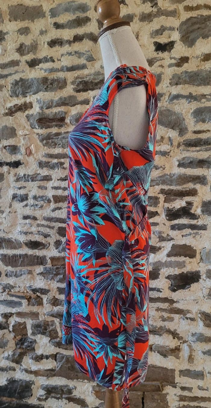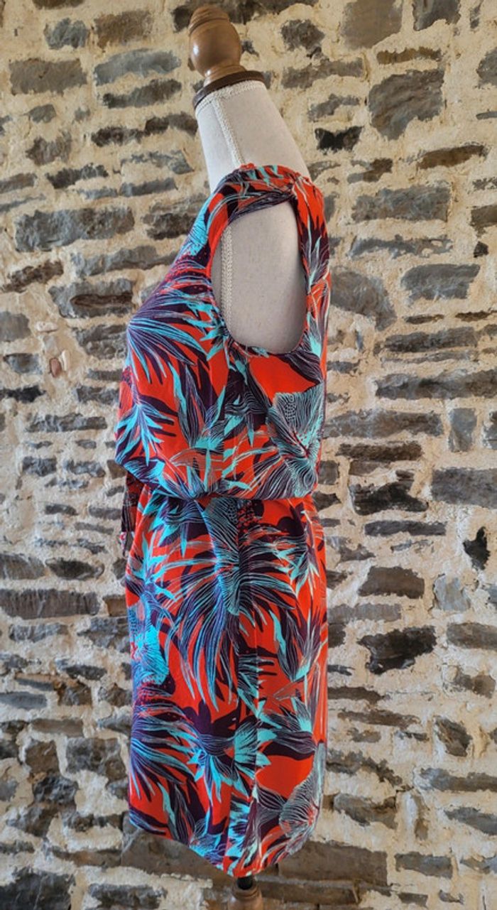 Robe d'été à fleurs hawaïennes bleu turquoise sur fond rouge corail Camaïeu Taille 36 - photo numéro 7