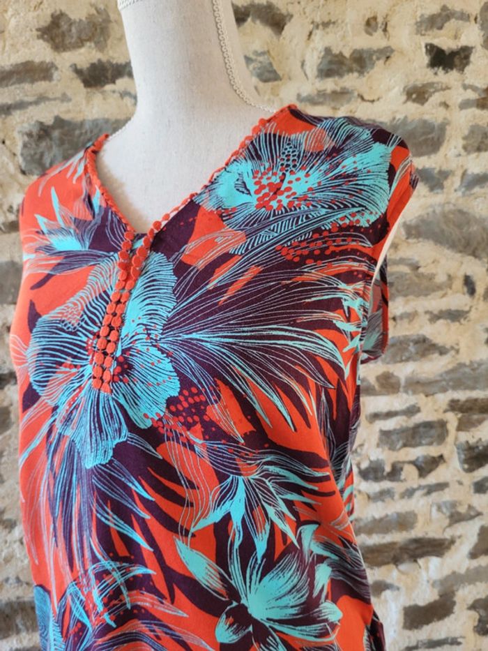 Robe d'été à fleurs hawaïennes bleu turquoise sur fond rouge corail Camaïeu Taille 36
