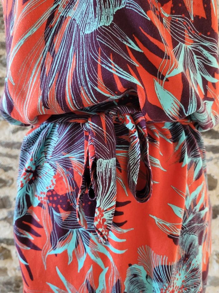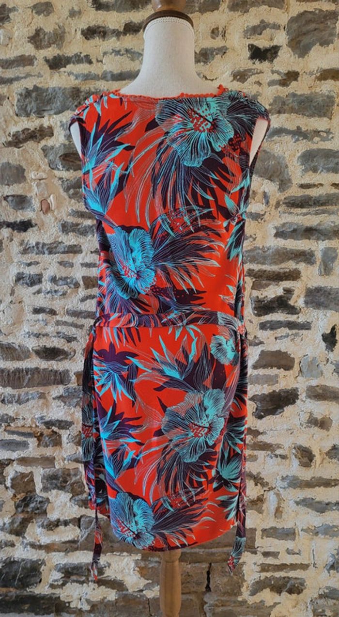 Robe d'été à fleurs hawaïennes bleu turquoise sur fond rouge corail Camaïeu Taille 36 - photo numéro 2