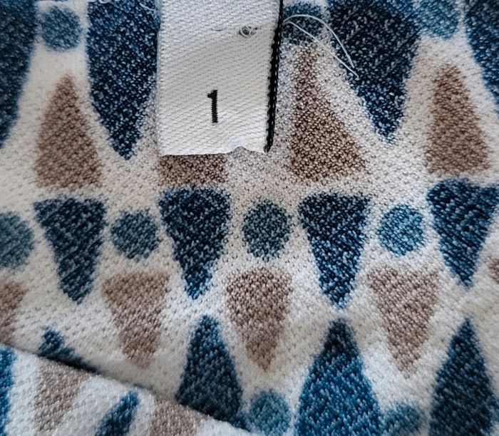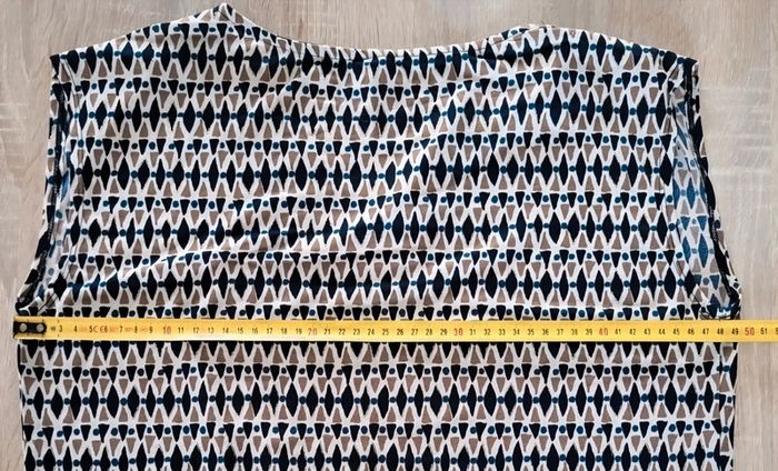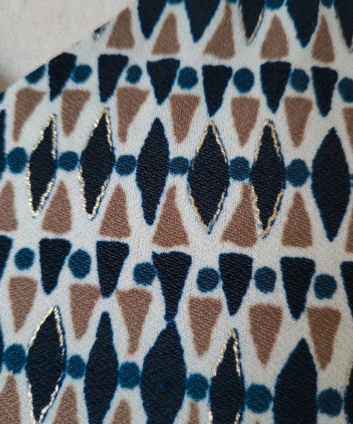 Très jolie blouse style débardeur à motifs bleu marine beige et blanc avec détails dorés irisés La Redoute (étiquette manquante) Taille 1 ou 36 Bien vérifier les mesures ci-dessous et en photos Aisselles 49cm Longueur 54cm Contient de l’elastane,  tissu extensible Légère, fluide et très agréable à porter En très bon état #matka27_taille36 #blouse #sansmanches #taille36 #laredoute #bleu #marine #motifs #beige #doré #été #débardeur #irisé