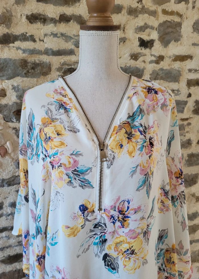 Très jolie blouse manches 3/4 très larges, à motifs fleuris écrue rose jaune turquoise Blancheporte (étiquette manquante) Taille 42 Aisselles 53cm Longueur 67cm Légère fluide et agréable à porter Fermeture éclair sur l'avant En très bon état #matka27_taille42 #taille42 #blouse #écru #jaune #rose #motifs #fleurs #fleurie #mancheslarges #été #blancheporte