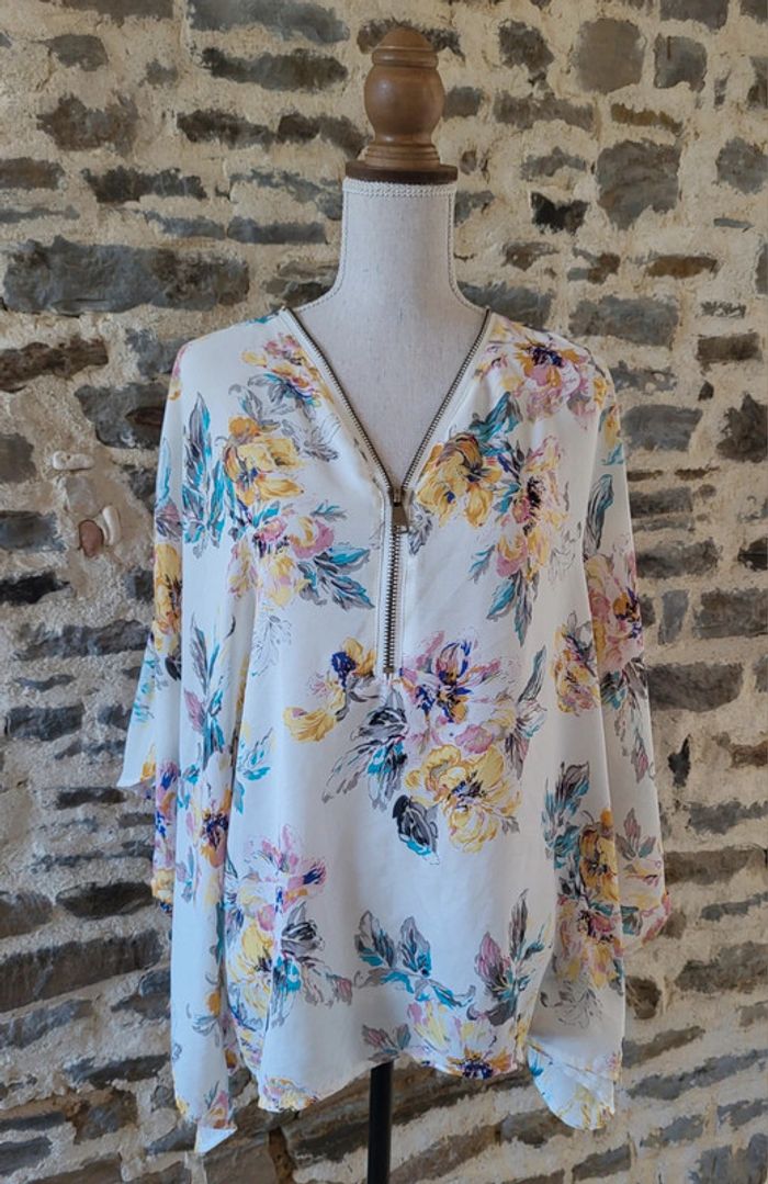 Blouse manches très larges écrue à fleurs jaune rose turquoise Blancheporte Taille 42 - photo numéro 1