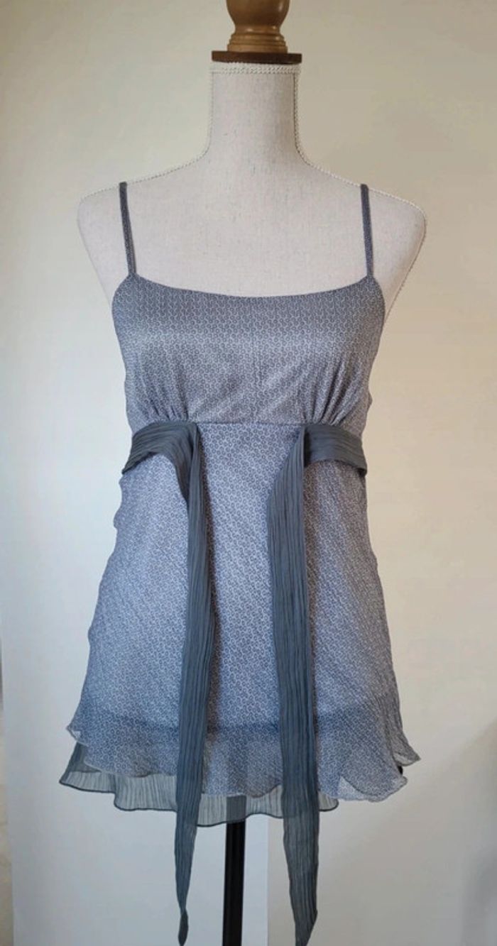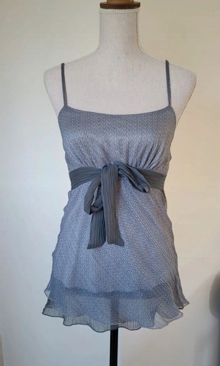 Joli débardeur en voile gris à motifs avec lien à nouer Kiabi Taille 36 38 (étiquetté 38 mais taille + comme un 36) Bretelles réglables Léger fluide et agréable à porter En très bon état #matka27_taille36 #débardeur #kiabi #taille3638 #gris #motifs #été