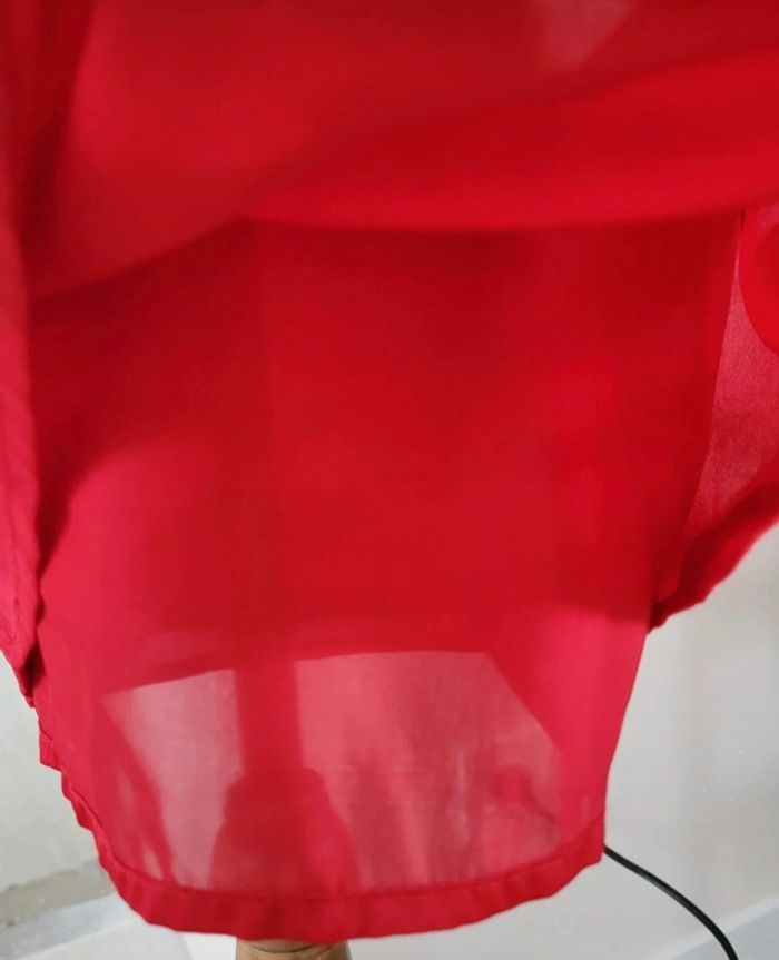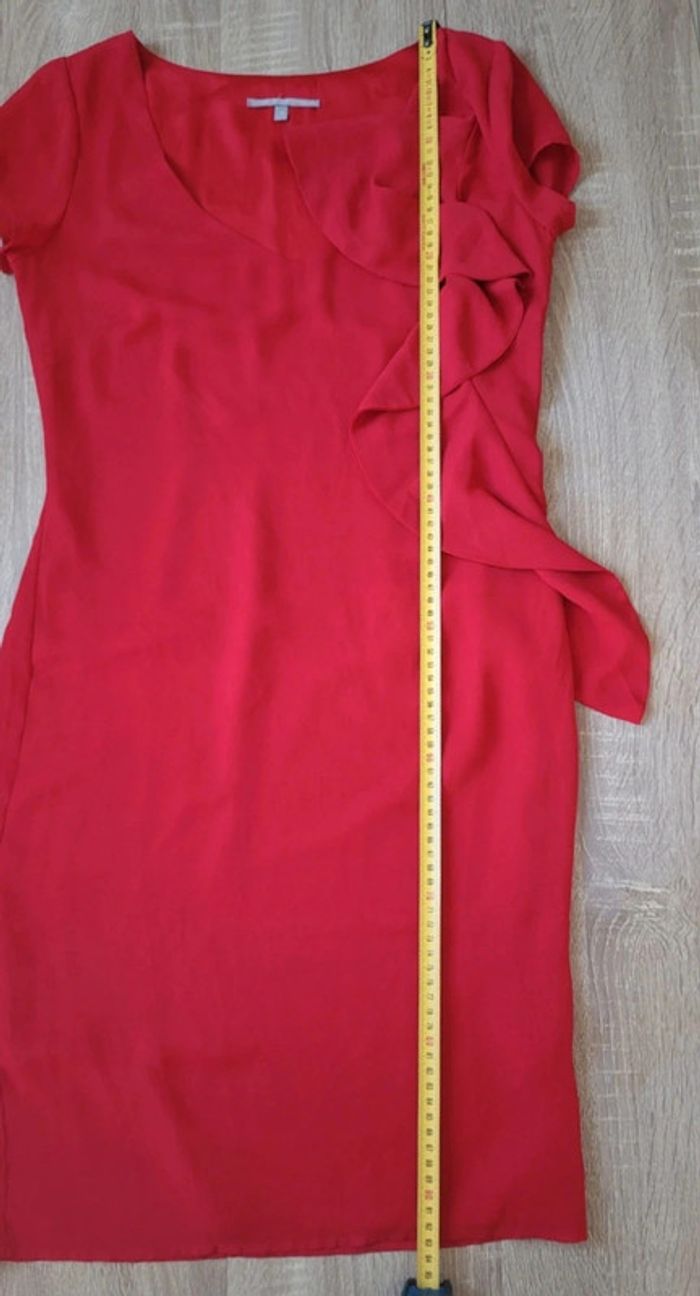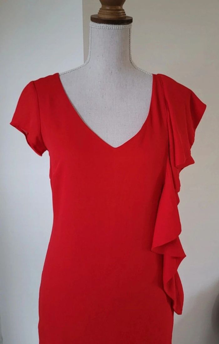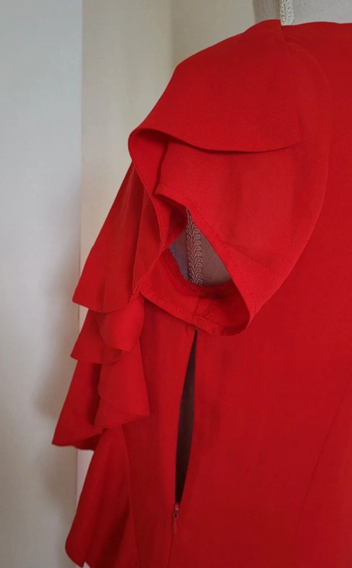 Très jolie robe de cérémonie rouge sans manches, effet volanté et fermeture éclair sur le côté