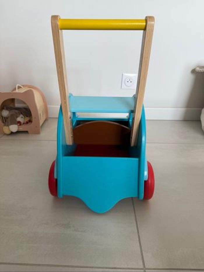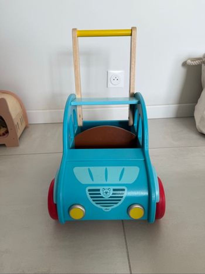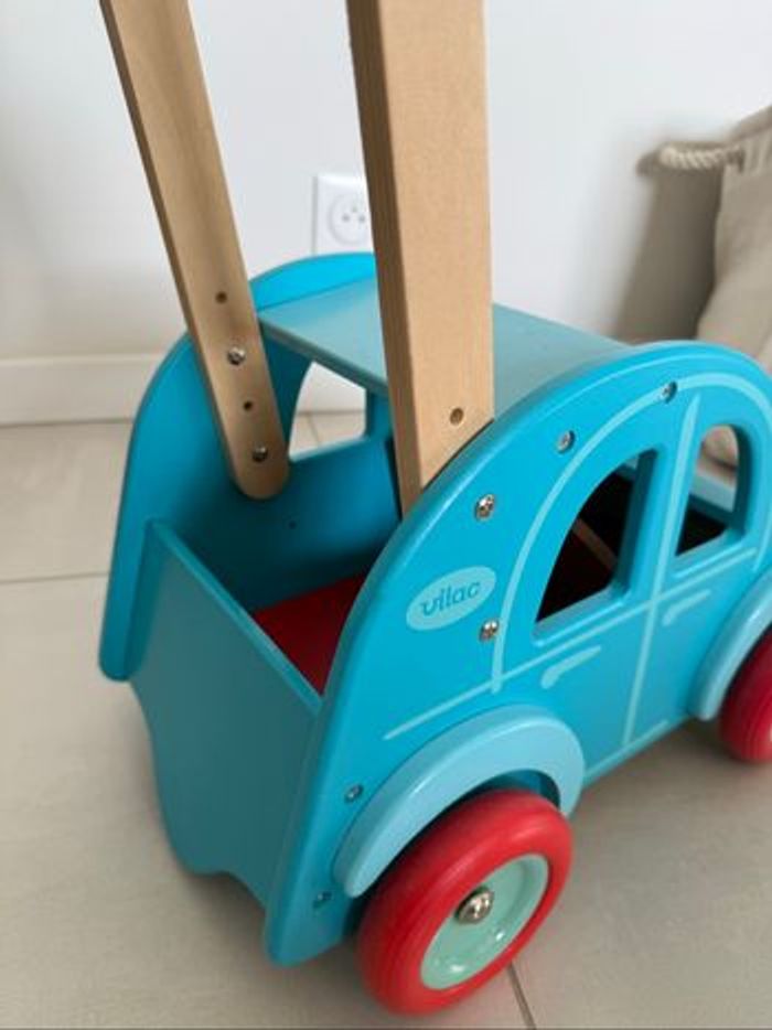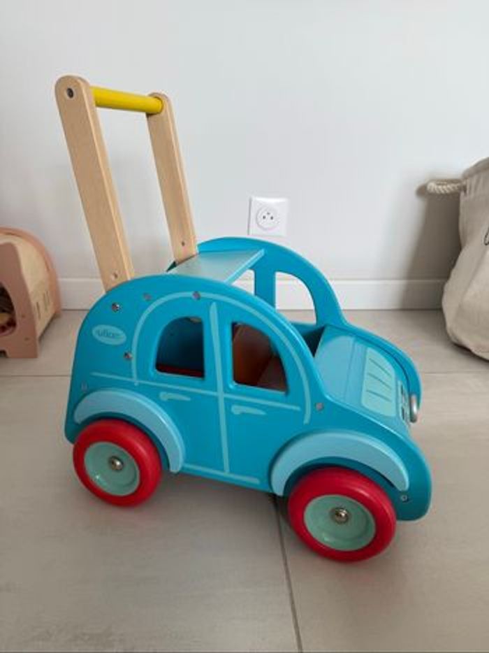Chariot de marche 2 CV Citroën de la marque française Vilac. * Jouet en bois solide et durable * Adaptée aux enfants dès 1 an * Parfait pour l'apprentissage de la marche dès 1 an * couleur bleu clair * roues équipée d'un système pour empêcher votre enfant de basculer en arrière. * coffre et les places à l'avant, permettront à votre bébé de transporter ses jouets et ses doudous partout dans la maison. * Dimensions : 45 x 44 x 26 cm * En très bon état ⚠️ remise en main propre uniquement secteur 33 ou 49