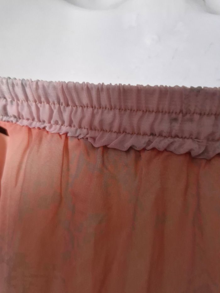 Cette longue jupe en voile couleur saumon a un petit imprimé peau de serpent original. Doublée par un tissu extensible et avec sa taille élastique froncée a l'arrière, elle est tres confortable a porter et sa fente de côté, lui laisse une côté sexy tout en vous laissant libre de vos mouvements. La taille n'est pas indiquée mais les mesures représentent un 44 Taille de 40cms a plat a un 52cms en tirant Hauteur 92cms Hauteur de la fente en partant du bas 55cms Je n'ai pas remarqué d'anomalie