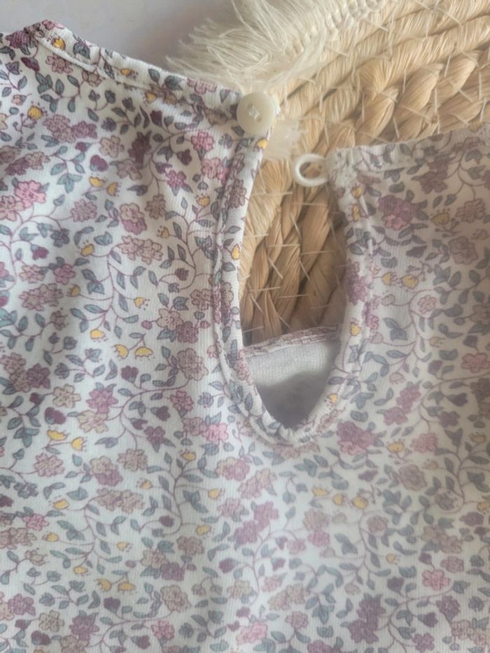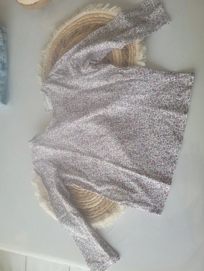 joli tee shirt manches longues motifs fleuris . fermeture par bouton à lanière au niveau du cou dans le dos.