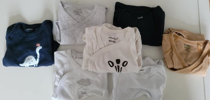 Lot de 25 bodys taille 6 mois, mixte. Marques variées (Kiabi, dreambee, etc.). Mélange de bodys croisés (cache-cœur) et de bodys à col américain. maison non-fumeur