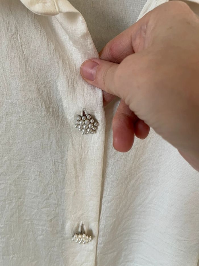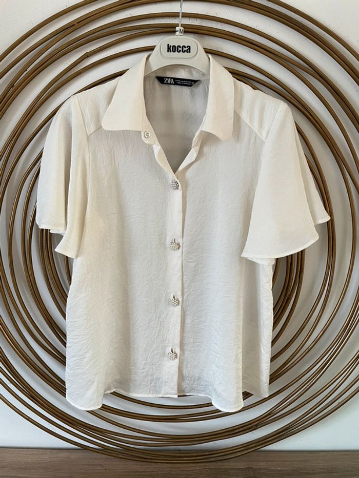 Je vends ce chemisier de la marque Zara en très bon état Taille XS Bouton en perle Coloris crème Longueur 57cm 100% polyester #chemisierzara #chemisiercrème #zara